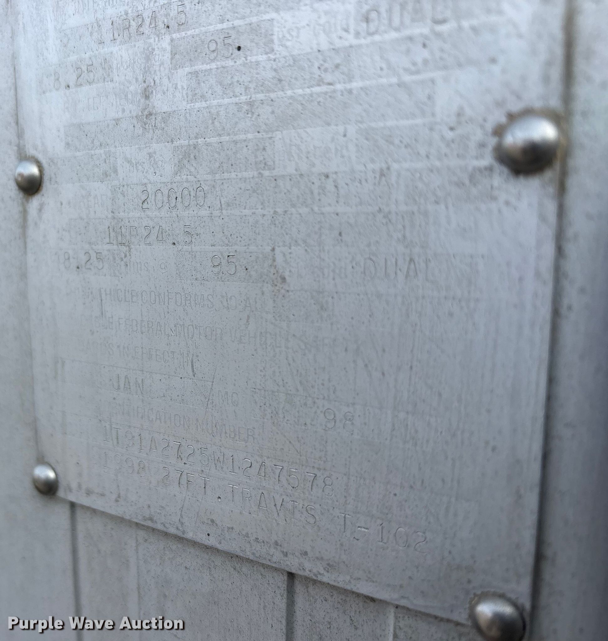 1998 Travis end dump trailer. VIN: 1T91A2725W1247578. Dimensions Overall Length: 26', Width: 102", Body Length: 26', Width: 102", Side height: 5'. Features Body type: Aluminum, Ram: Single, End gate: Air operated, Trailer controls, Roll tarp. Chassis Landing gear: Dual, Suspension: Spring, Brakes: Air, Axles: Tandem, GAWR: 20,000 lbs. Tires Steel wheels, Size: 11R24.5. Oklahoma title. Title distribution may be delayed up to 30 days from verification of funds. McAlester, OK 74502