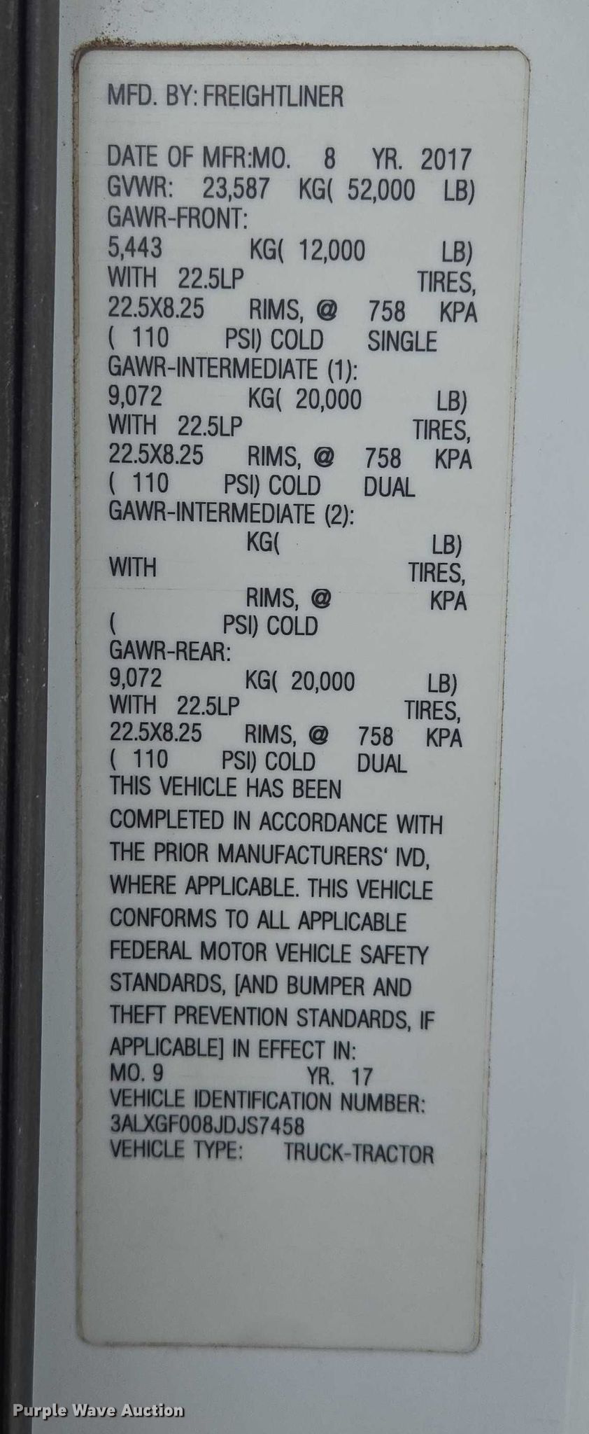 Purple Wave is selling a used Truck Tractor in Minnesota. This item is a 2018 Frieghtliner Cascadia semi truck with the following: Miles: 736,573 on odometer, VIN: 3ALXGF008JDJS7458, Unit #: 317