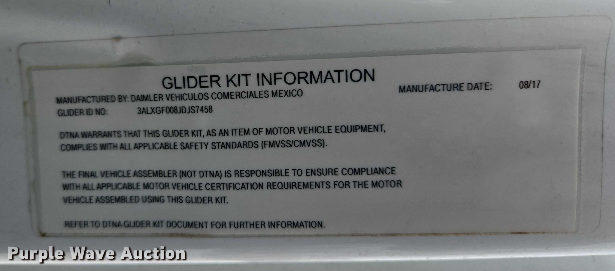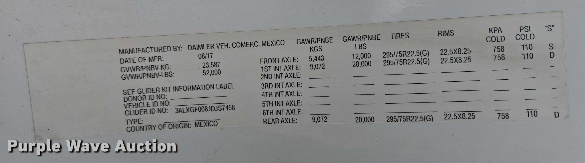 2018 Frieghtliner Cascadia semi truck. Miles: 736,573 on odometer, VIN: 3ALXGF008JDJS7458, Unit #: 317. Engine Detroit Diesel Series 60, Cylinders: 6, Fuel type: Diesel, Engine brake. Transmission Eaton Fuller, Manual, Speed: 13. Chassis Axles: Tandem, Differential lock: Inter-axle, Suspension: Air Dump valves, Brakes: Air, GVWR: 52,000 lbs. Interior AC, Heat, Heated mirrors, Power windows, Power locks, Cruise control, Air ride cab, Sleeper Sleeper length: 68", Beds: Double bunk, Refrigerator, Rear climate control. Features Deck plate: Aluminum, Fifth wheel type: Air operated, Sliding, Fuel tank: Dual. Tires Size: 295/75R22.5. Notes Windshield chipped or cracked, Jump start required during on-site data collection. Minnesota reconstructed title. Title distribution may be delayed up to 30 days from verification of funds. Rosen's Inc. Fairmont, MN 56031