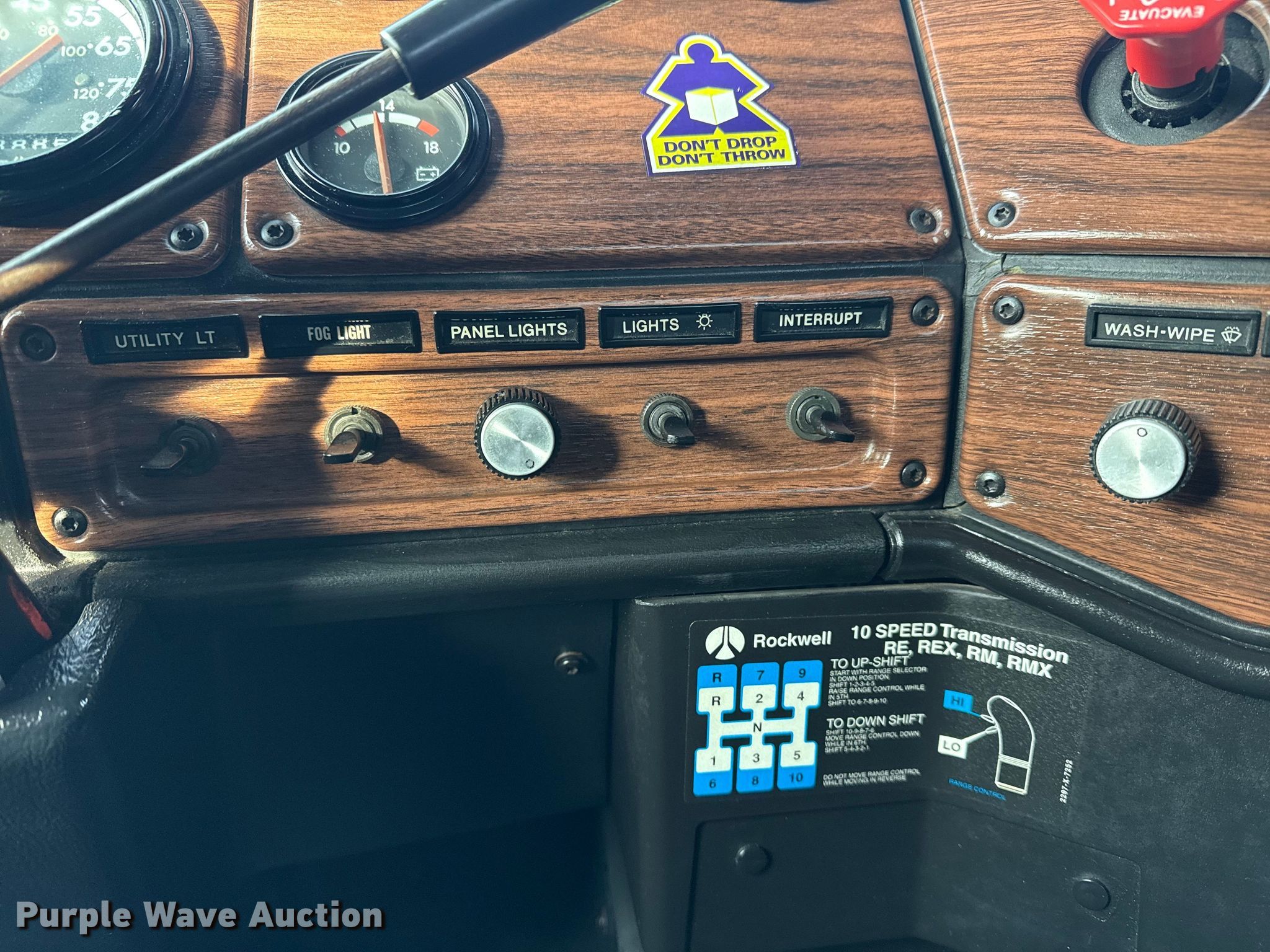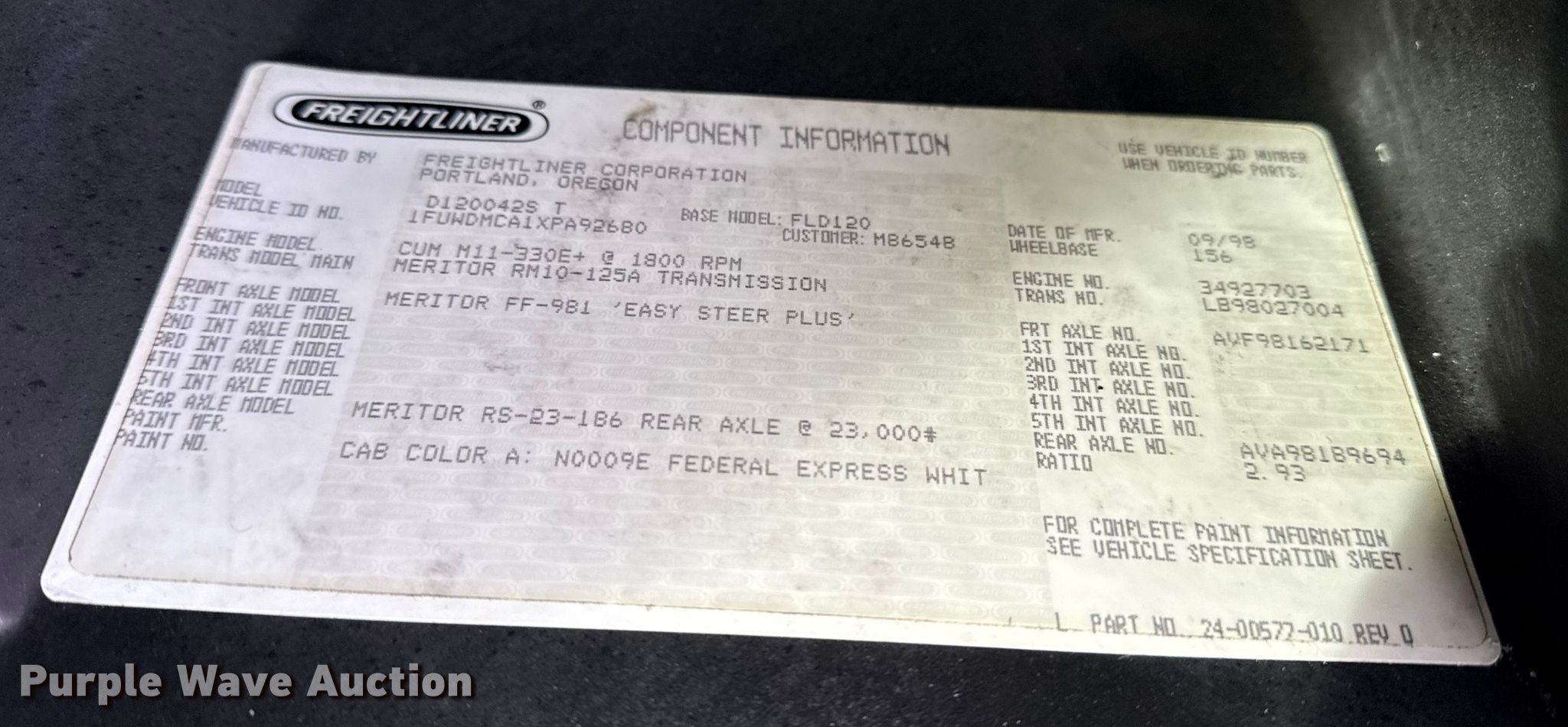 1999 Freightliner semi truck. Miles: 748,885 on odometer, VIN: 1FUWDMCA1XPA92680. Engine Cummins M11, Serial: 34927703, Displacement: 10.8L, Cylinders: 6, Fuel type: Diesel, HP: 330. Transmission Rockwell, Manual, Speed: 10. Chassis Axles: Single, Differential lock: Inter-axle, Suspension: Air, Brakes: Air, GVWR: 32,000 lbs FAWR: 12,000 lbs, RAWR: 20,000 lbs. Interior AC, Heat, Heated mirrors, Cruise control, Air ride cab. Features Deck plate: Aluminum, Fifth wheel type: Fixed, Fuel tank: Dual. Tires Size: 295/75R22.5. Notes Windshield chipped or cracked. Oklahoma classic title. Seller is an Oklahoma licensed motor vehicle dealer. Buyers may be required to provide identification to the licensed dealer to comply with state laws. Title will be assigned and distributed by the dealer. Please contact the seller for distribution questions. Title distribution may be delayed up to 30 days from verification of funds. Collinsville, OK 74021