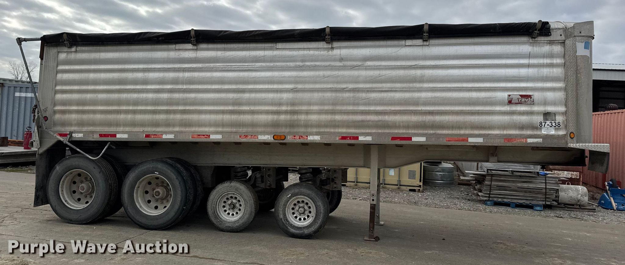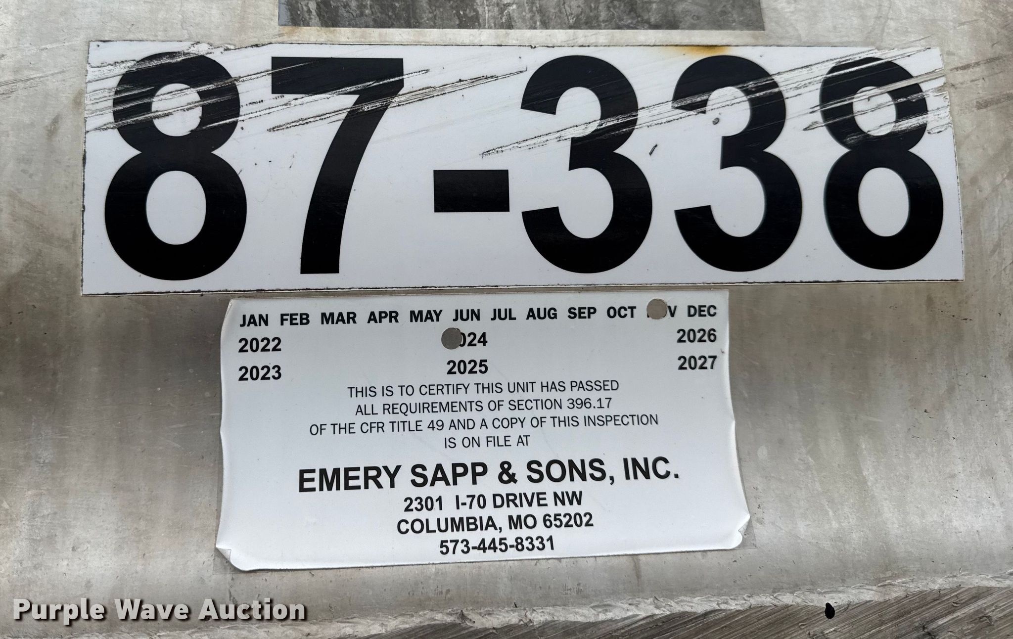 2008 Travis Body & Trailer, Inc. end dump trailer. VIN: 48X2E264981005719, Unit #: 87-338. Dimensions Overall Length: 26' 9", Width: 96", Body Length: 26', Width: 96", Side height: 61". Features Body type: Aluminum, Ram: Single, End gate: Air operated, Roll tarp. Chassis Landing gear: Dual, Suspension: Air, Brakes: Air, Axles: Quad. Tires Aluminum wheels, Size: 11R22.5. Missouri title. Title distribution may be delayed up to 30 days from verification of funds. Emery Sapp & Sons, Inc... Columbia, MO 65202