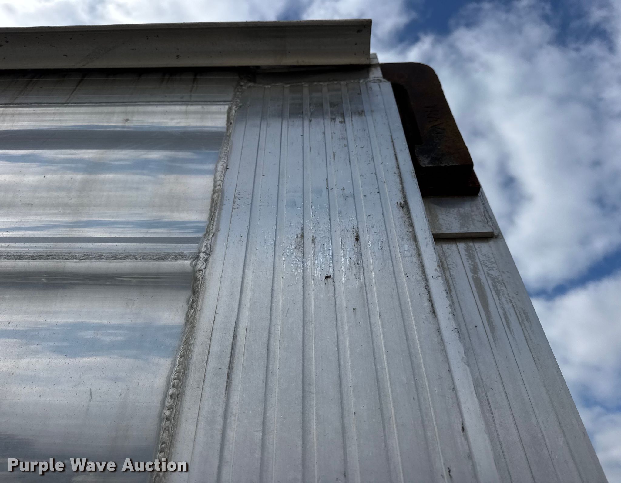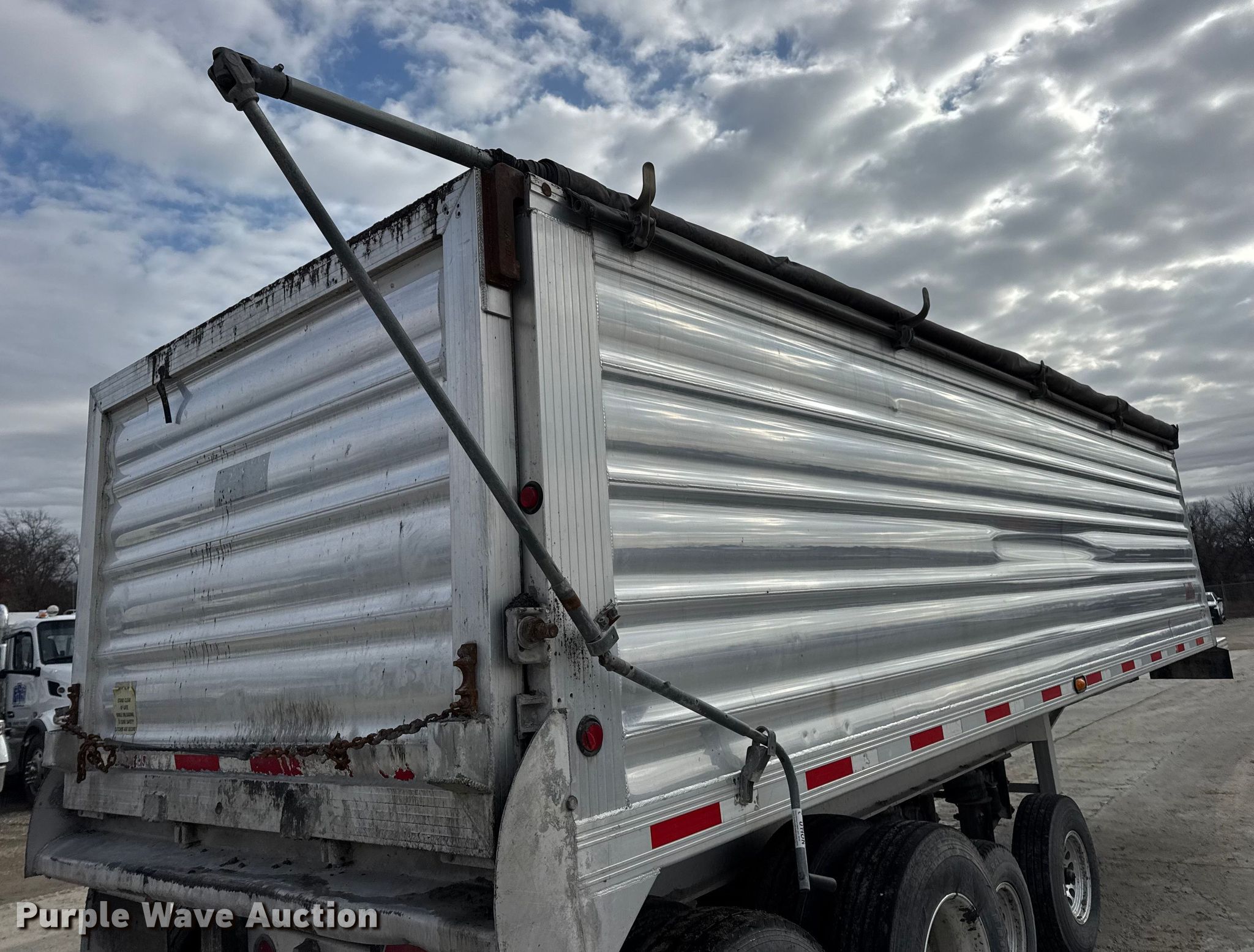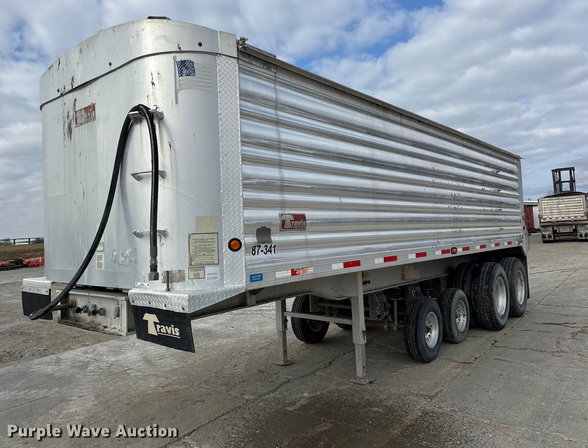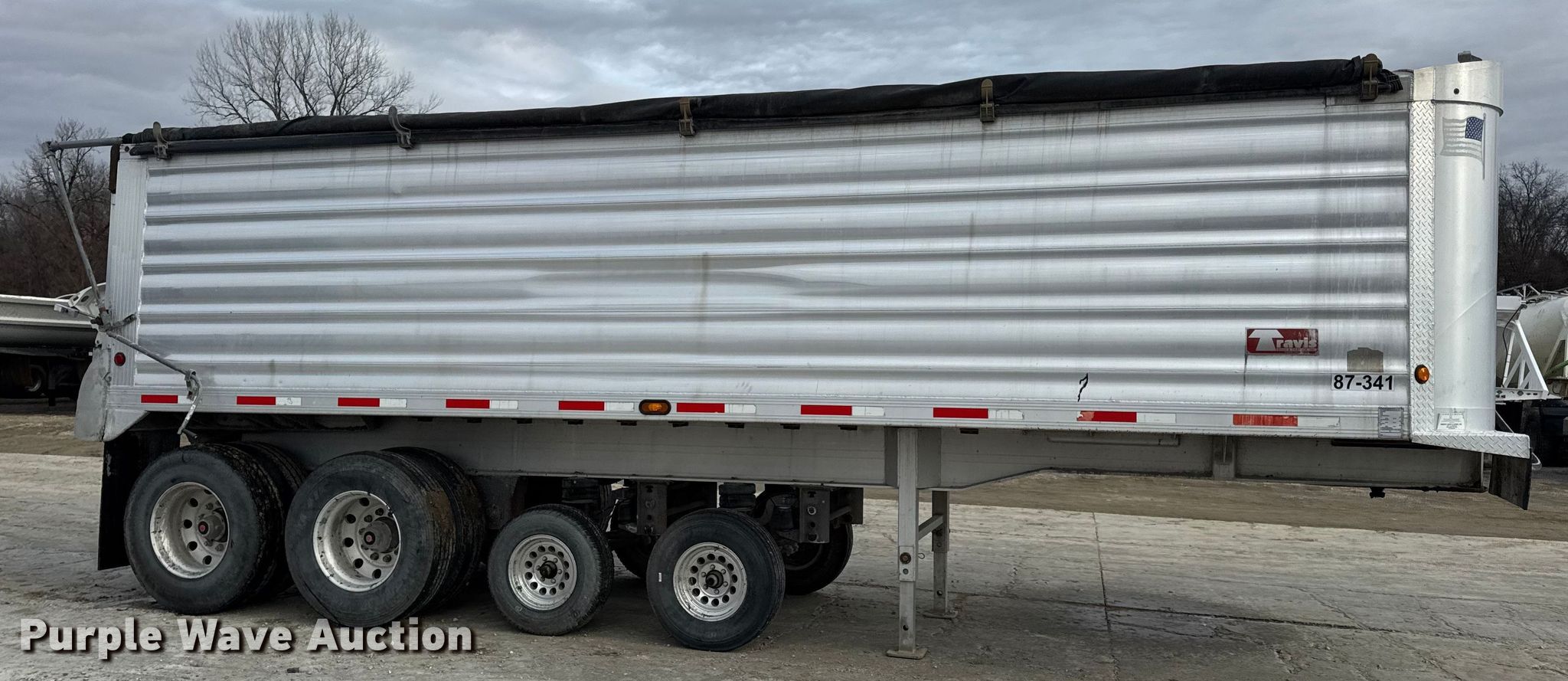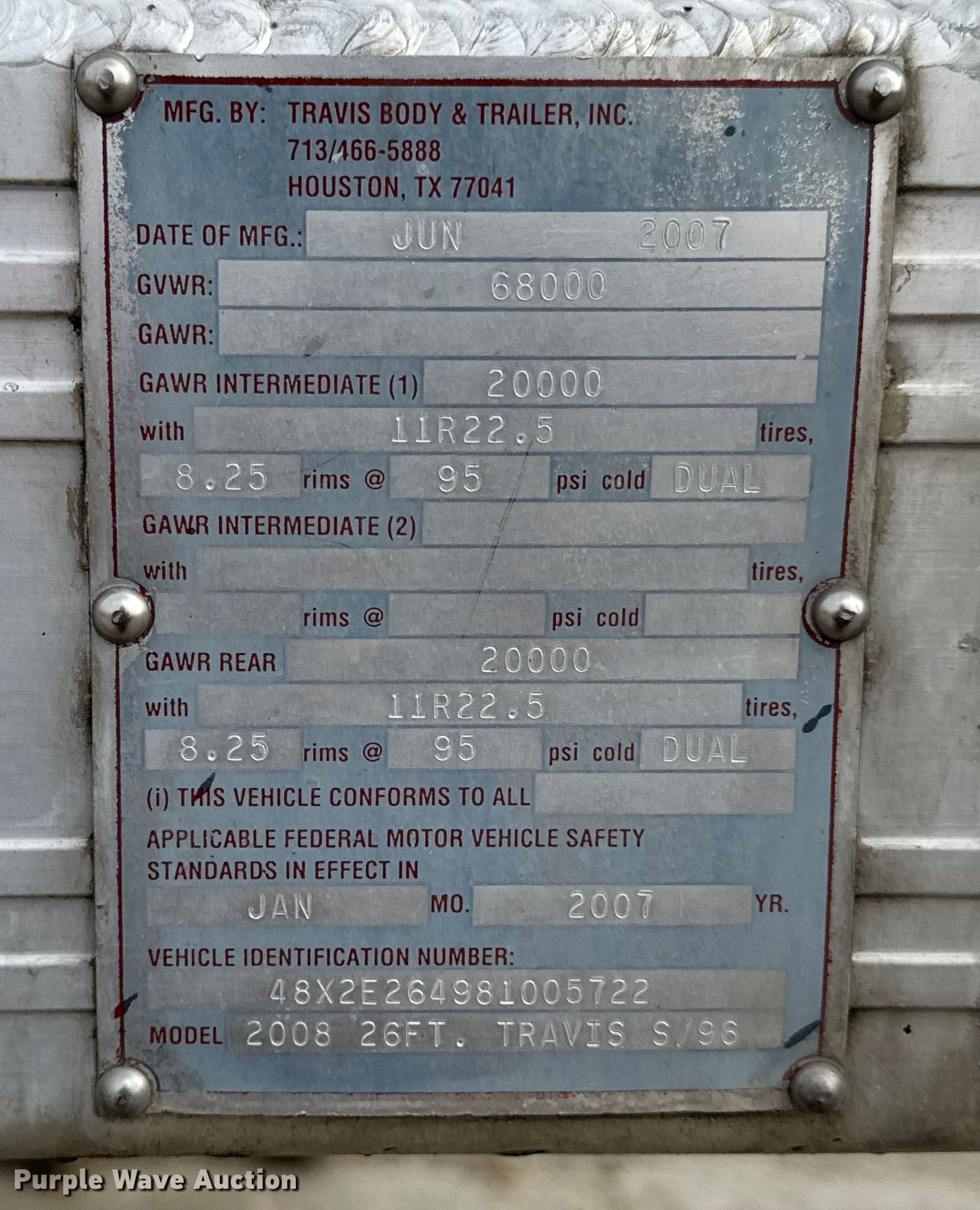 2008 Travis Body & Trailer, Inc. end dump trailer. VIN: 48X2E264981005722, Unit #: 87-341. Dimensions Overall Length: 26' 10", Width: 96", Body Length: 26', Width: 96", Side height: 68". Features Body type: Aluminum, Ram: Single, End gate: Air operated, Roll tarp. Chassis Landing gear: Dual, Suspension: Air, Brakes: Air, Axles: Quad, GVWR: 68,000 lbs, GAWR: 20,000 lbs. Tires Aluminum wheels, Size: 11R22.5. Missouri title. Title distribution may be delayed up to 30 days from verification of funds. Emery Sapp & Sons, Inc... Columbia, MO 65202