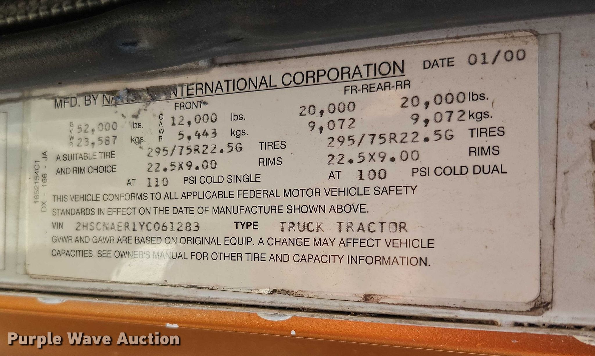 Purple Wave is selling a used Truck Tractor in Missouri. This item is a 2000 International 9400i semi truck with the following: Miles: 371,329 on odometer, VIN: 2HSCNAER1YC061283