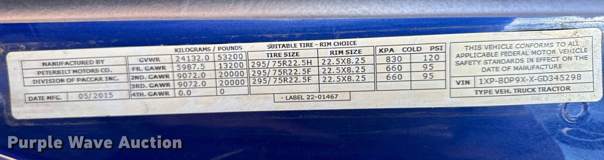 Purple Wave is selling a used Truck Tractor in Kansas. This item is a 2016 Peterbilt 579 semi truck with the following: Miles: 1,660,724 on odometer, VIN: 1XPBDP9XXGD345298