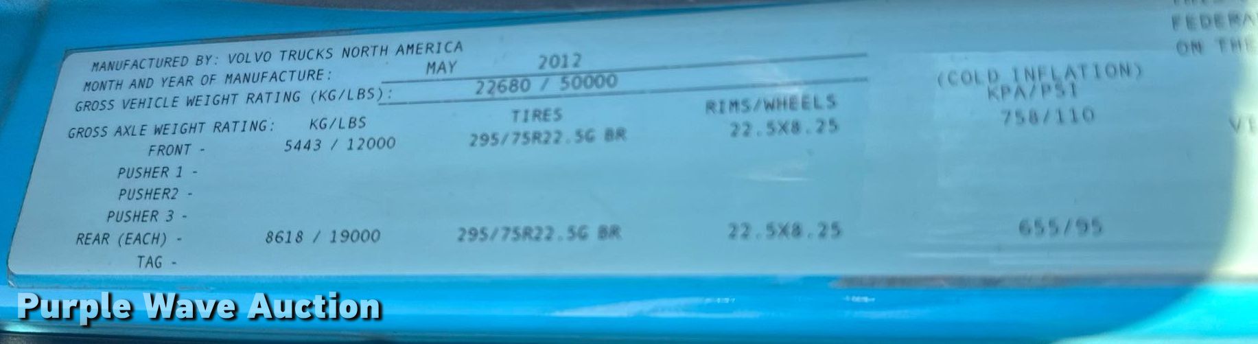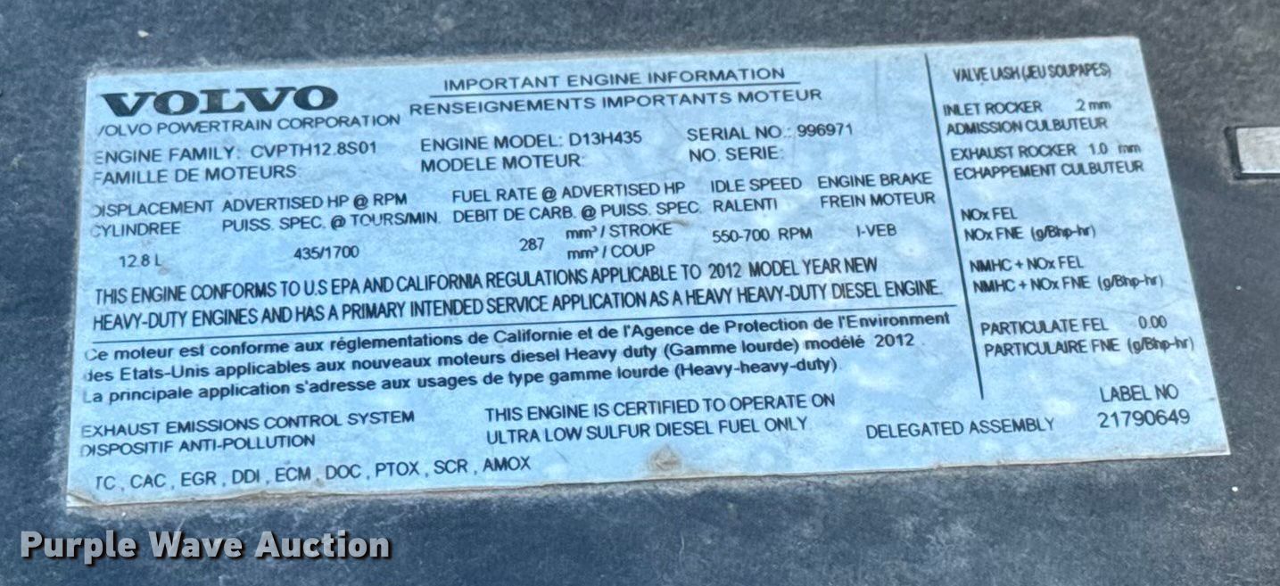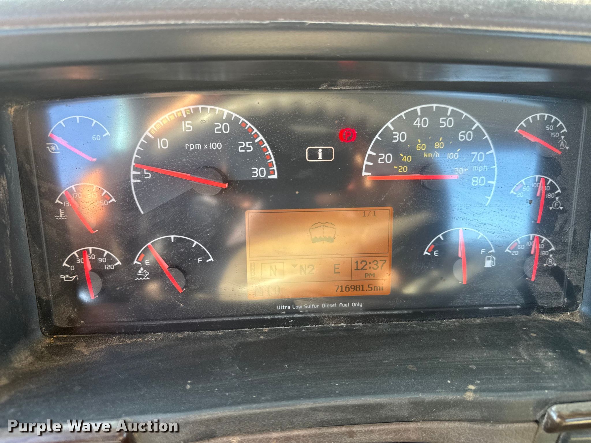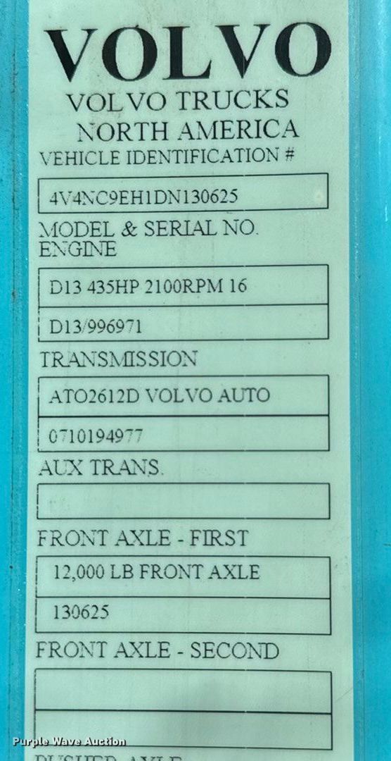 2013 Volvo VNL semi truck. Miles: 716,981 on odometer, VIN: 4V4NC9EH1DN130625. Engine Volvo D13H435, Serial: 996971, Displacement: 12.8L, Cylinders: 6, Fuel type: Diesel, HP: 425. Transmission Volvo ATO2612D, Automatic. Chassis Axles: Tandem, Differential lock: Inter-axle, Suspension: Air Dump valves, Brakes: Air, GVWR: 50,000 lbs FAWR: 12,000 lbs, RAWR: 19,000 lbs. Interior AC, Heat, Heated mirrors, Cruise control, Air ride cab. Features Fifth wheel type: Fixed, Fuel tank: Single. Tires Size: 295/75R22.5. Notes Passenger side exterior door handle issues, Starting issues, hard to start. Oklahoma title. Title distribution may be delayed up to 14 days from verification of funds. Helena, OK 73741