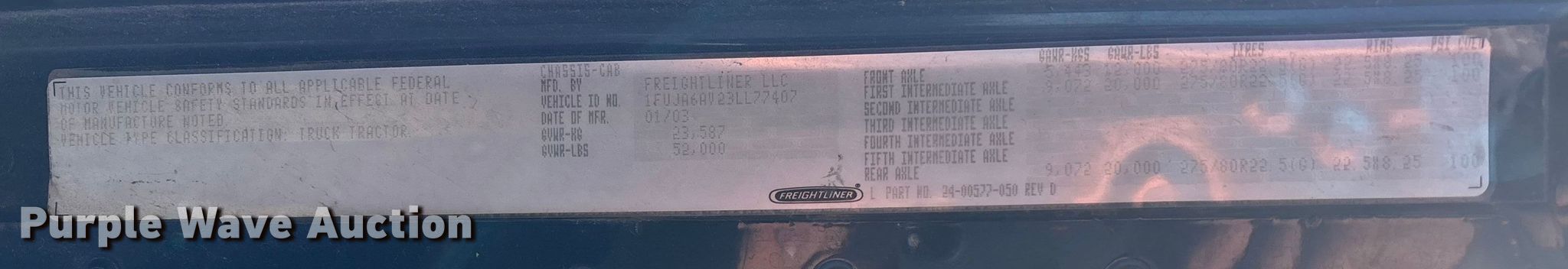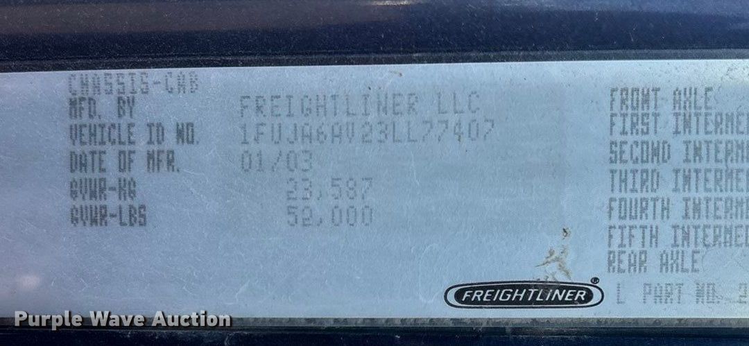 Purple Wave is selling a used Truck Tractor in Nebraska. This item is a 2003 Freightliner Columbia semi truck with the following: Miles: 308,192 on odometer, Hours: 9,350 on meter, VIN: 1FUJA6AV23LL77407