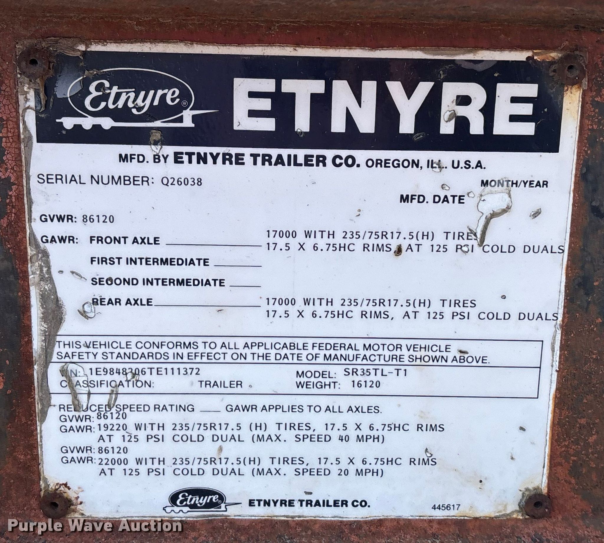 1996 Etnyre SR35TL-T1 drop deck equipment trailer. VIN: 1E9848206TE111372. Dimensions Overall Length: 40', Width: 102", Deck Length: 40', Width: 102", Top deck length: 8' 8", Rear deck length: 27', Hydraulic tail length: 8', Ramps: Hydraulic Length: 36". Features Deck type: Wood, Hydraulic controls: Manual. Chassis Suspension: Air, Brakes: Air, Axles: Tandem, GVWR: 86,120 lbs. Tires Steel wheels, Size: 235/75R17.5. Nebraska title. Title distribution may be delayed up to 14 days from verification of funds. Lottman & Carpenter Construction. Diller, NE 68342