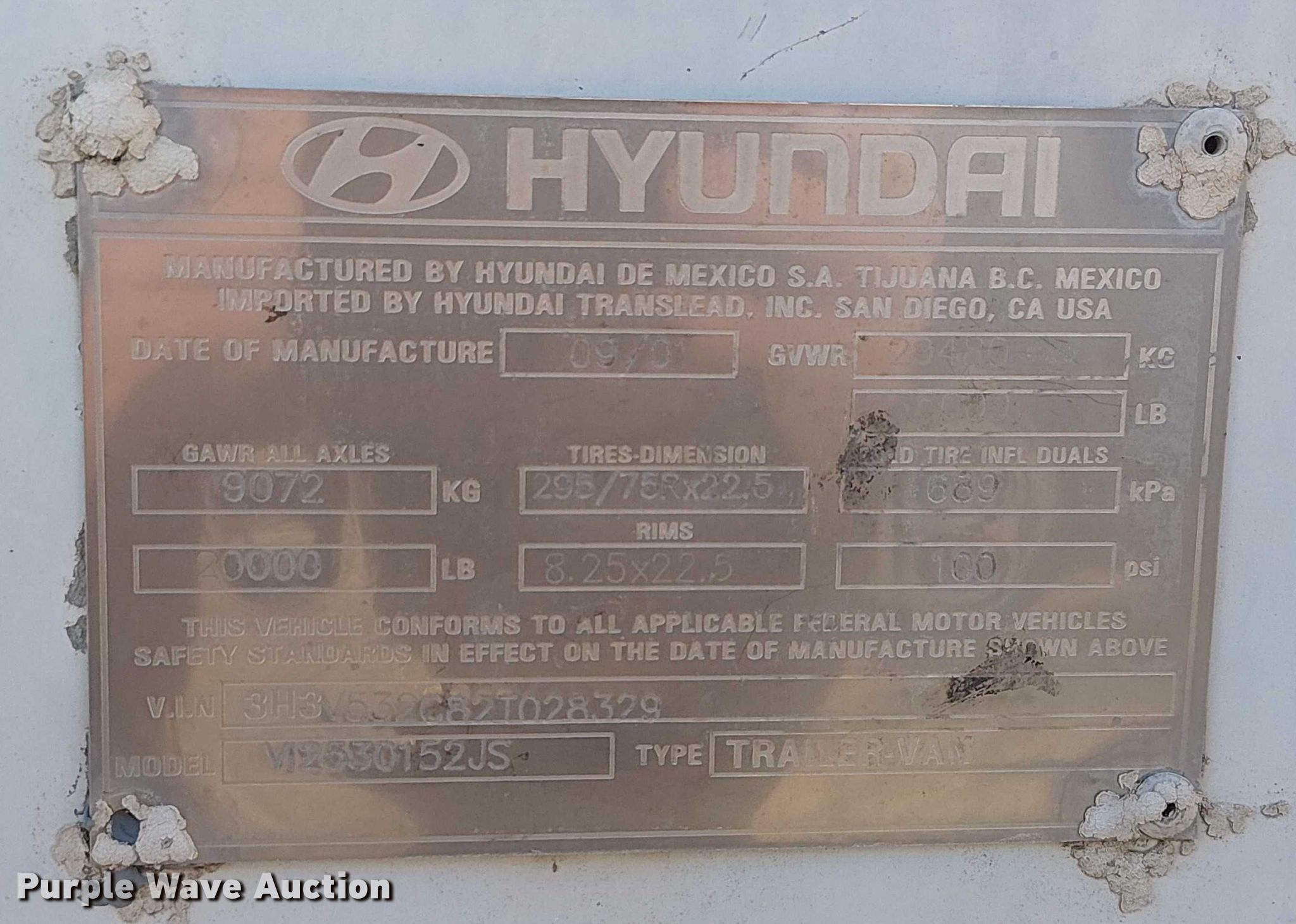 Purple Wave is selling a used Dry Van Trailer in Missouri. This item is a 2002 Hyundai Translead dry van trailer with the following: VIN: 3H3V532C82T028329