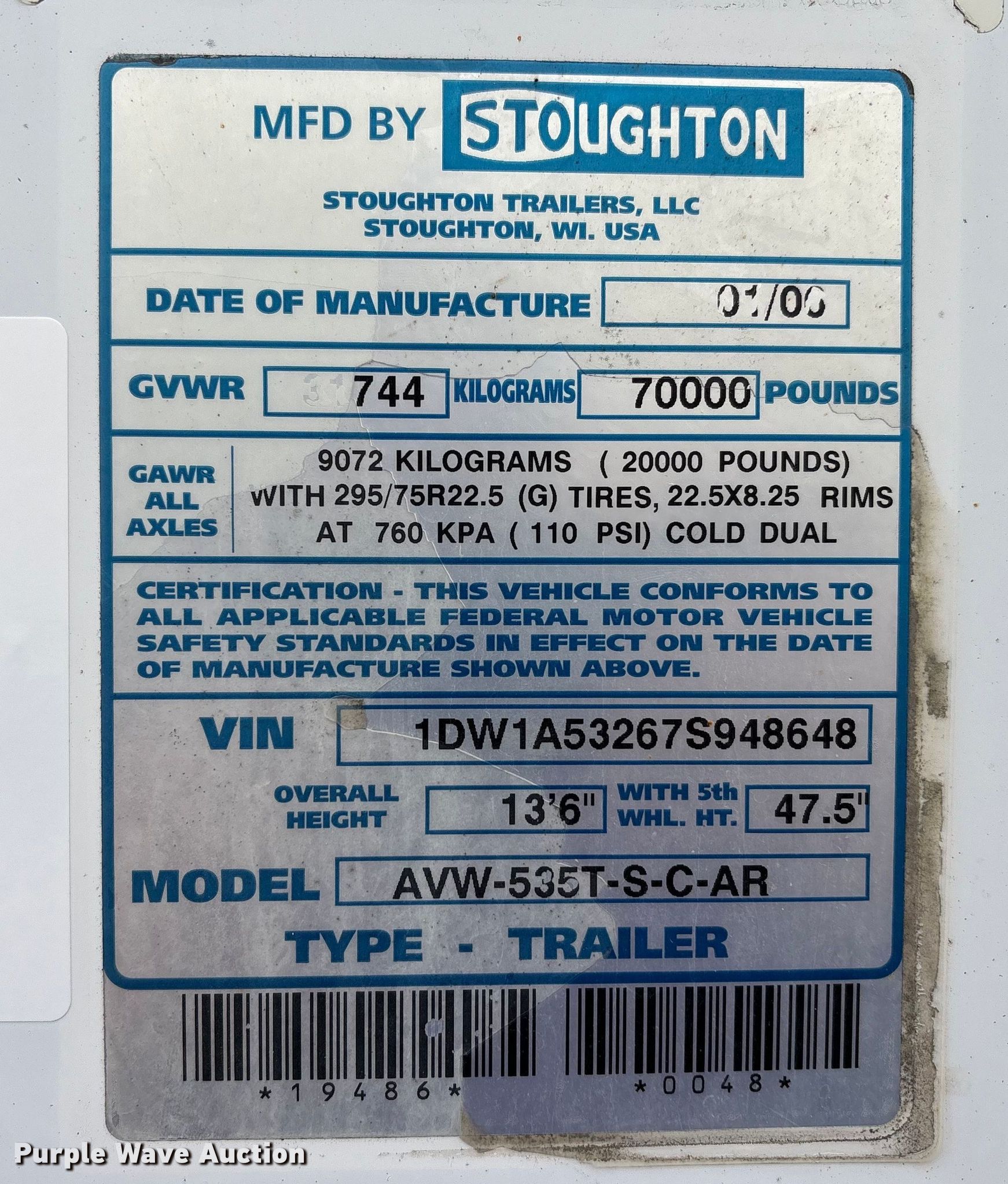 Purple Wave is selling a used Dry Van Trailer in Michigan. This item is a 2007 Stoughton Trailers AVW-535T-S-C-AR dry van trailer with the following: VIN: 1DW1A53267S948648
