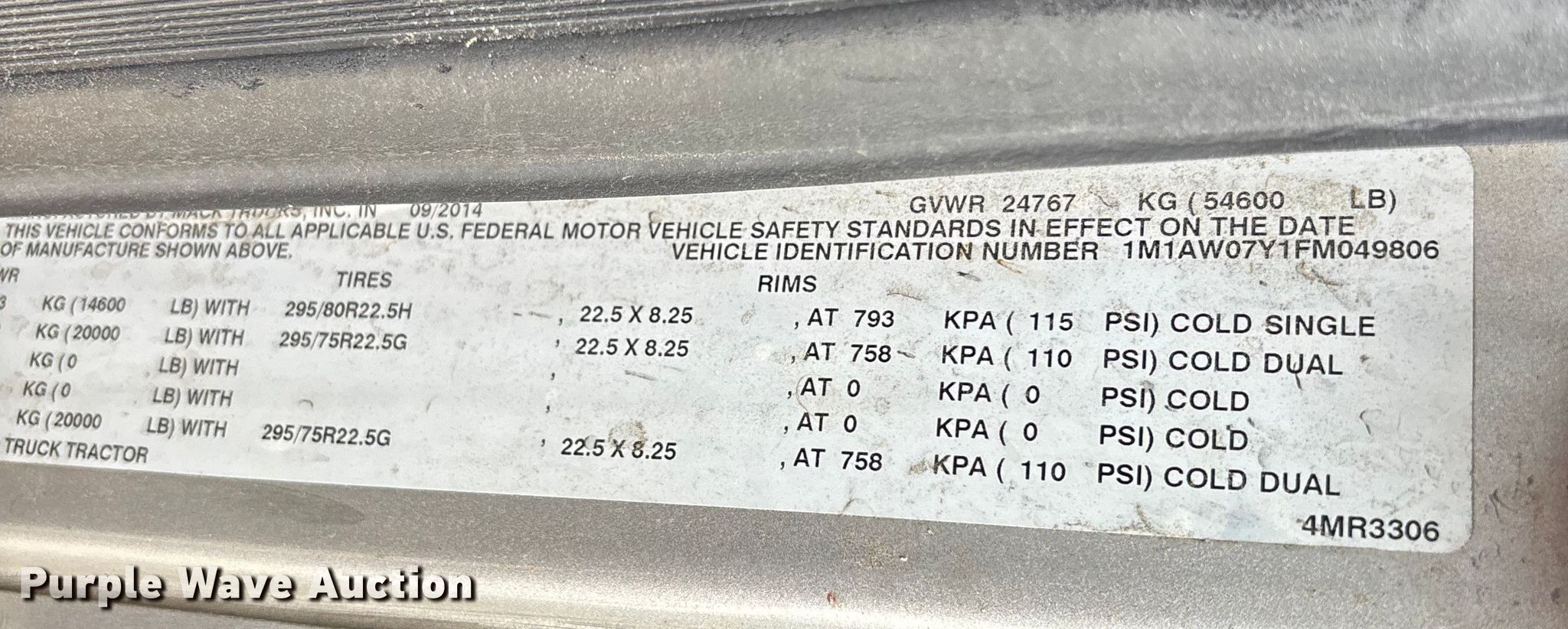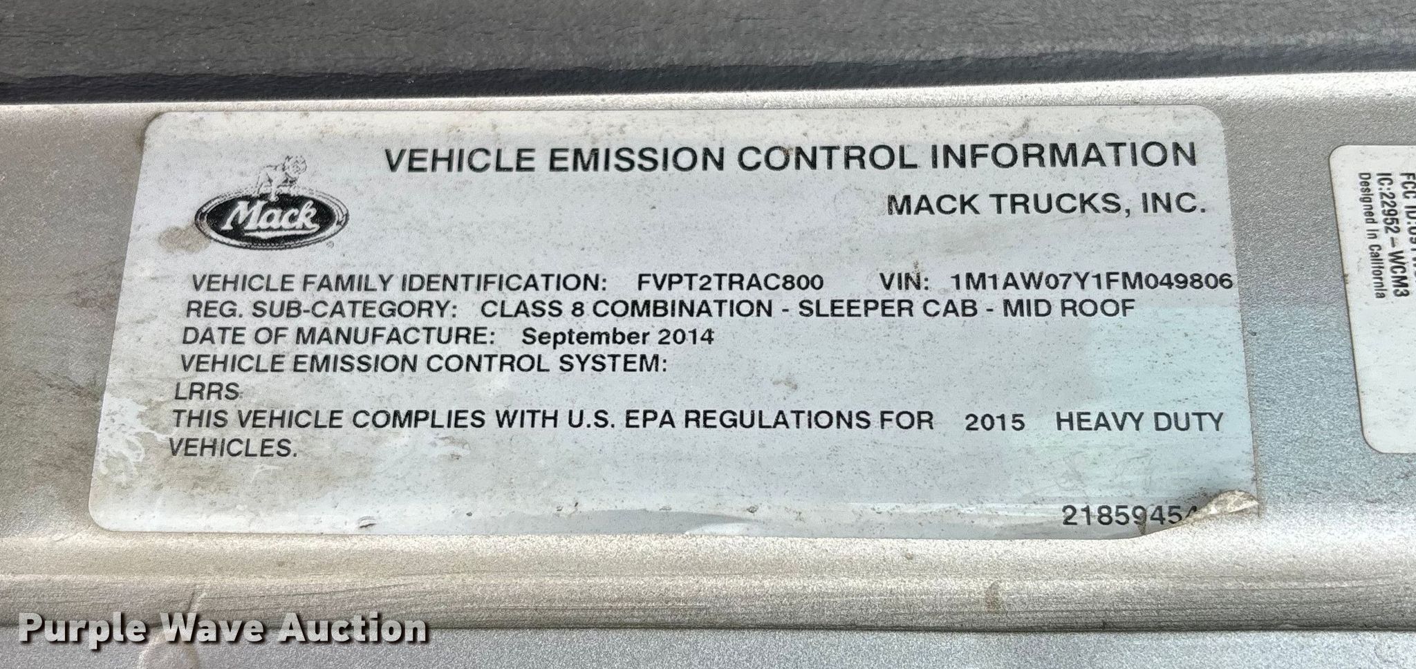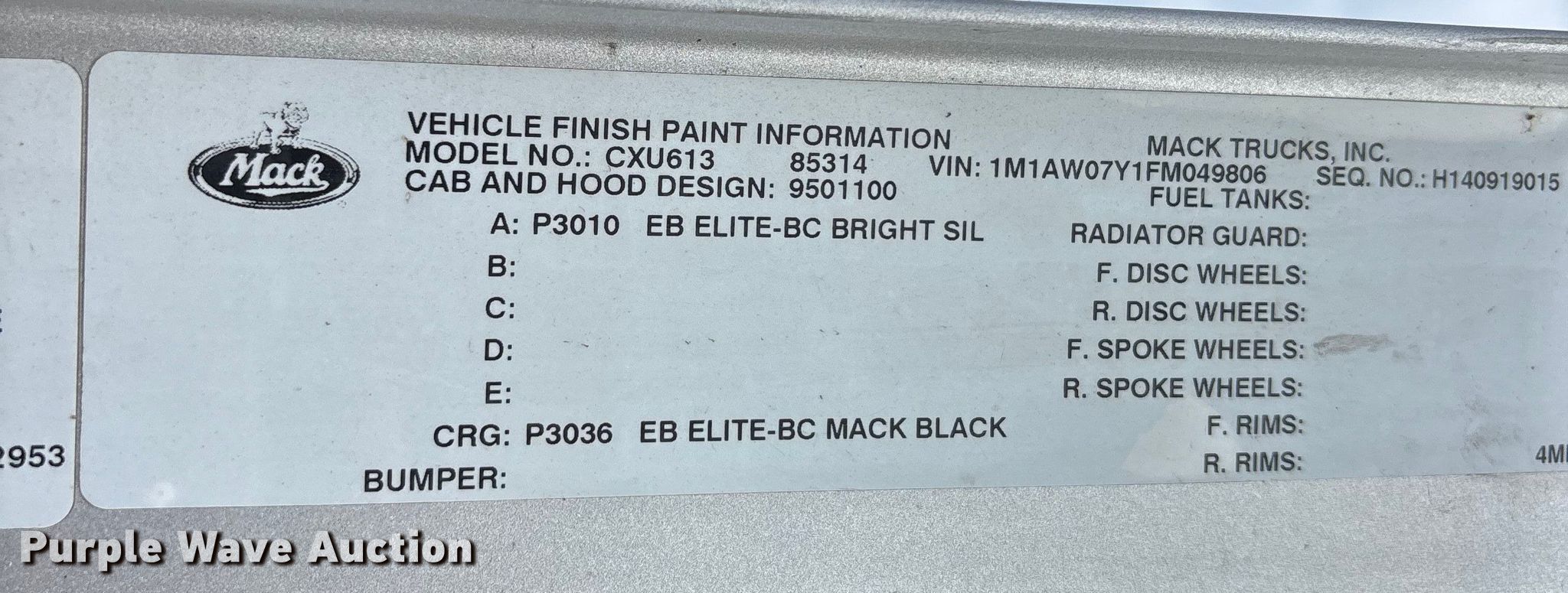 Purple Wave is selling a used Truck Tractor in South Carolina. This item is a 2015 Mack CX613 semi truck with the following: Miles: 742,101 on odometer, VIN: 1M1AW07Y1FM049806, Unit #: 64853825