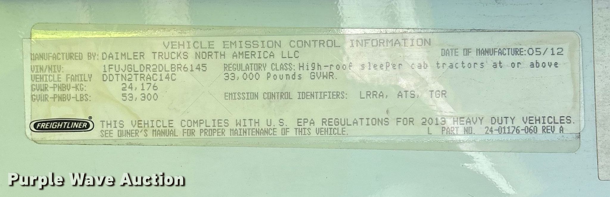 Purple Wave is selling a used Truck Tractor in North Carolina. This item is a 2013 Freightliner Cascadia semi truck with the following: Miles: 1,112,539 on odometer, VIN: 1FUJGLDR2DLBR6145, Unit #: 69466885