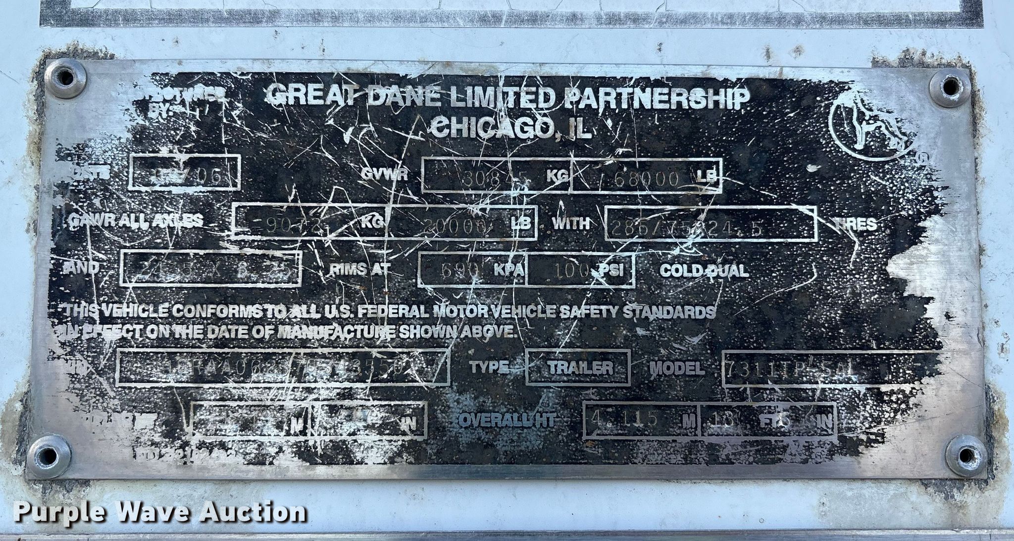 Purple Wave is selling a used Dry Van Trailer in Indiana. This item is a 2007 Great Dane 7311TP-SAL dry van trailer with the following: VIN: 1GRAA06237G343550, Unit #: 94093095