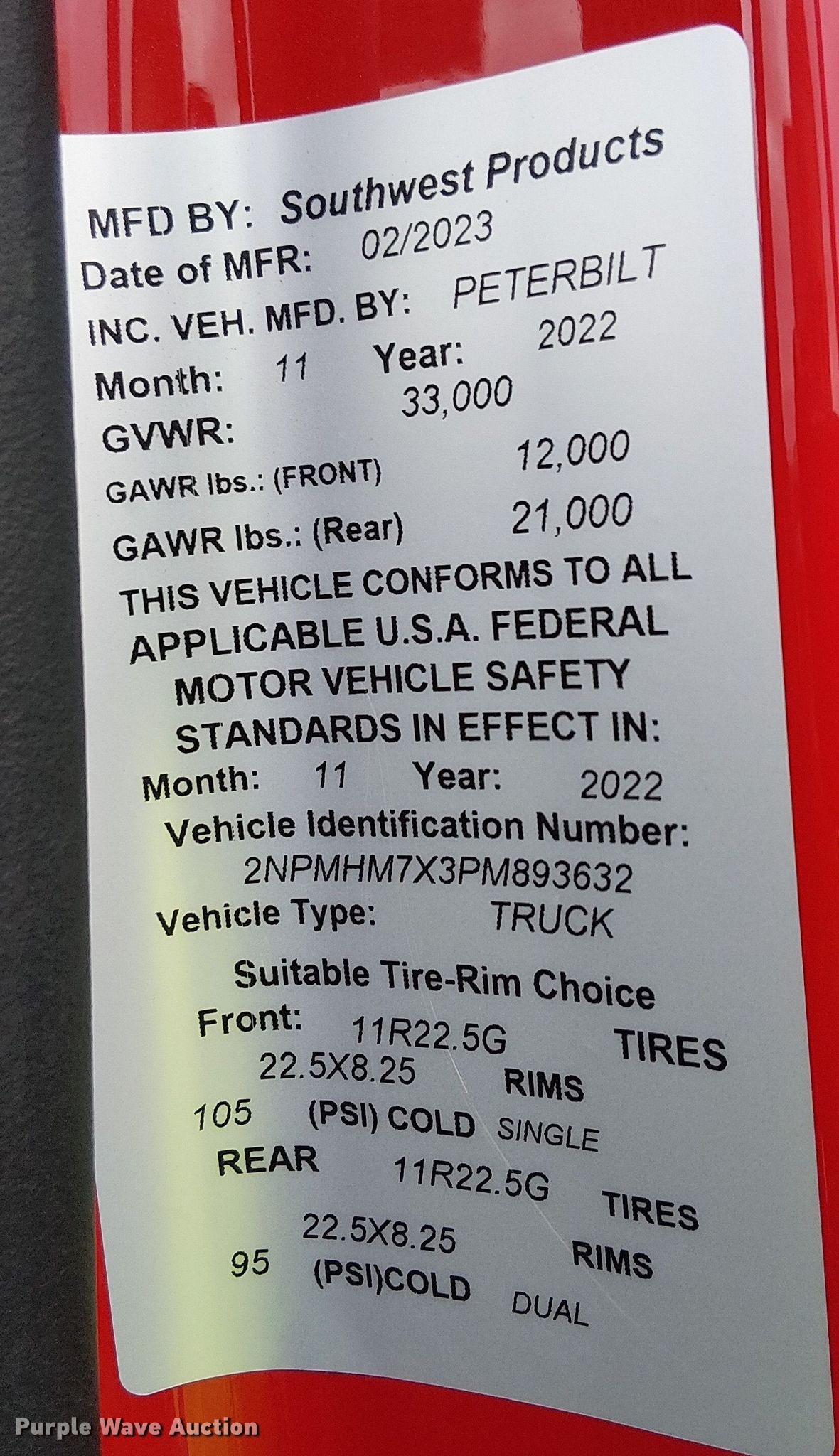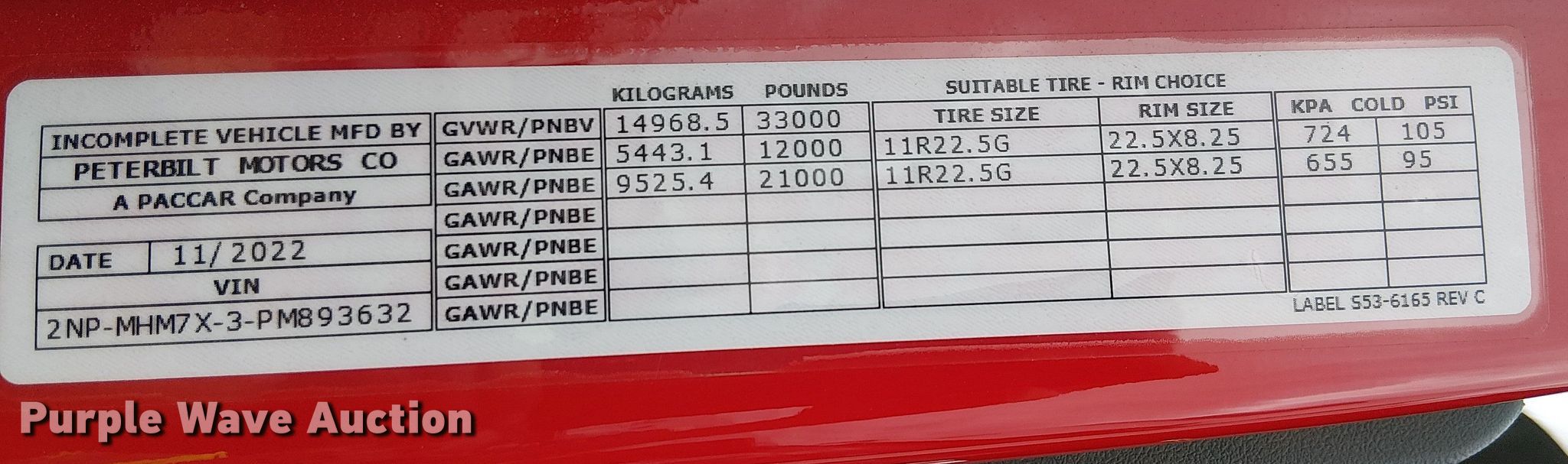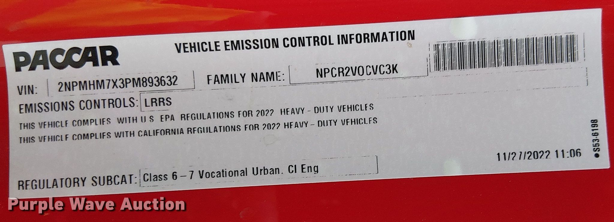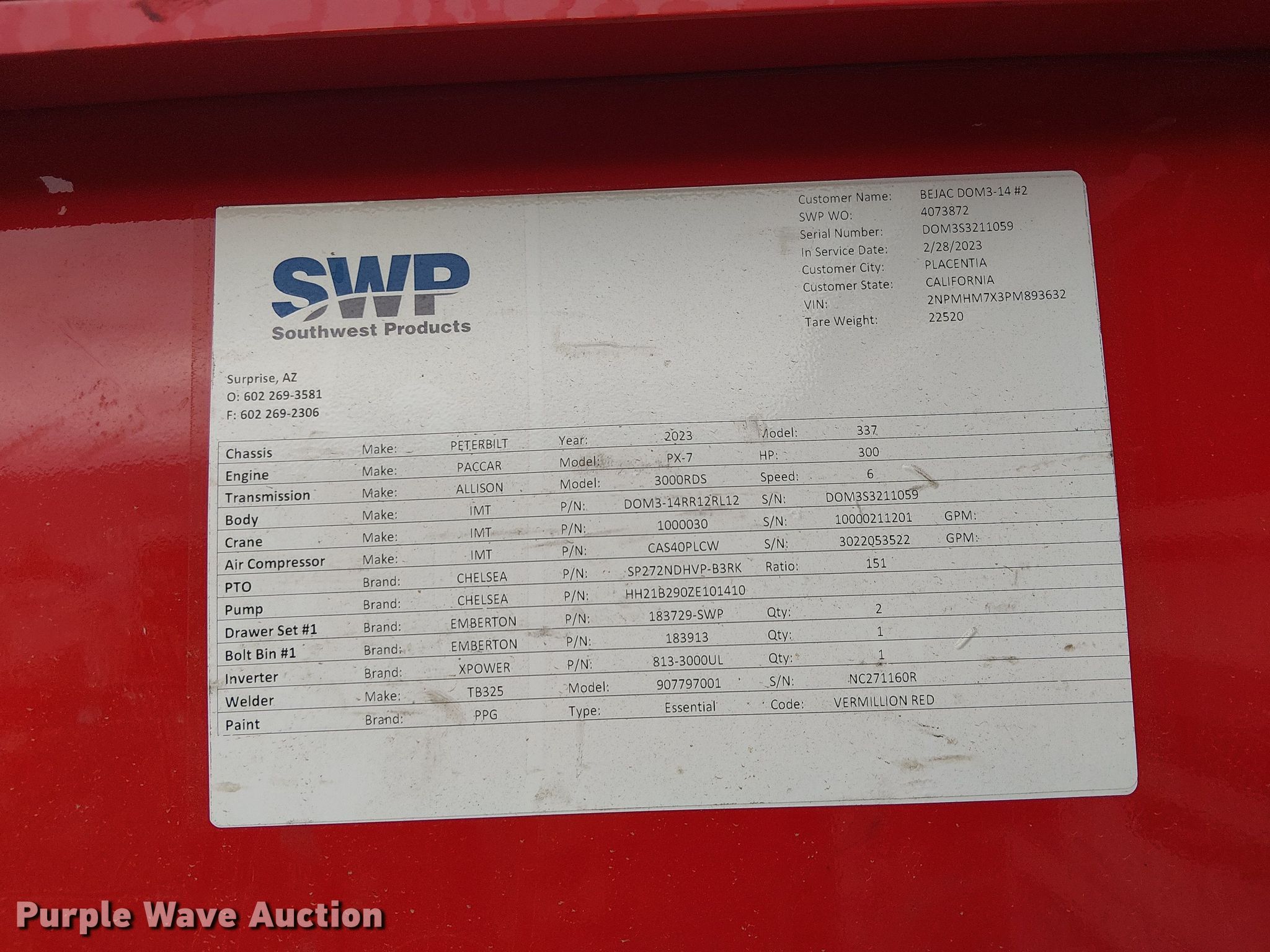 2023 Peterbilt 200 utility / service truck. Miles: 88,116 on odometer, VIN: 2NPMHM7X3PM893632, Unit #: 93688015. Engine Cummins B6.7 300, Displacement: 6.7L, Cylinders: 6, Fuel type: Diesel, HP: 300. Transmission Automatic. Chassis Axles: Single, Suspension: Air, Brakes: Air, PTO, GVWR: 33,000 lbs. Interior AC, Heat, Power windows, Power locks, Cruise control. Features Bed Utility bed, SWP DOMS3, Serial: DOM3S3211059, Length: 164", Width: 96", Torch bottle rack Tanks not included, Welder/generator Miller Trailblazer 325, Fuel type: Diesel, Welder type: Tig, Mig, Stick (AC/DC), Air compressor IMT CAS40PL-CW, AKG, Oil/lube system Hose reels, Nozzles, Pump, Reservoirs Hydraulic fluid, Motor oil, Crane Iowa Mold Tooling Co. 1000-30 K584010, Maximum boom length: 12' Maximum lift capacity: 10,000 lbs.. Tires Size: 11R22.5. Notes Dash warning indicator: ABS, Service, Battery, Jump start required during on-site data collection, Collision damage, Unknown operating condition of crane, Unknown operating condition of welder, Unknown operating condition of air compressor, Non-operational unit Unit must be towed or hauled. Insurance salvage, stored at a secured facility. Please review REQUIRED REMOVAL INSTRUCTIONS. Buyer responsible for all aspects of state emissions compliance. Titles will be distributed after confirmation of payment and removal. California salvage title. Title distribution may be delayed up to 30 days from verification of funds. Insurance Salvage. Perris, CA 92571
