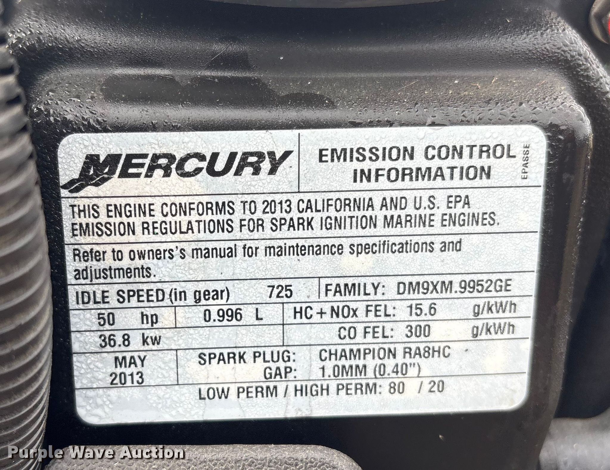 1983 Polar Kraft 17' Aluminum Boat. Length: 17', Hull ID: PLR72196M84C. Engine Engine type: Outboard, 2013 Mercury 1A51413BZ, Serial: 1C233916, Cylinders: 4, Fuel type: Gas, HP: 50, Outdrive Propeller: Stainless steel. Trailer Lowe, Overall length: 20', Overall width: 92", Ball hitch size: 2", Axles: Tandem, Tire size: ST175/80R13. Notes Non-operational unit. Boat- Oklahoma title. Motor- Oklahoma title. Trailer - Transfer of ownership documentation will be a bill of sale. Title distribution may be delayed up to 30 days from verification of funds. Oklahoma title. Oklahoma Department of Wildlife Conservation. 9097 N 34th St W. Porter, OK 74454