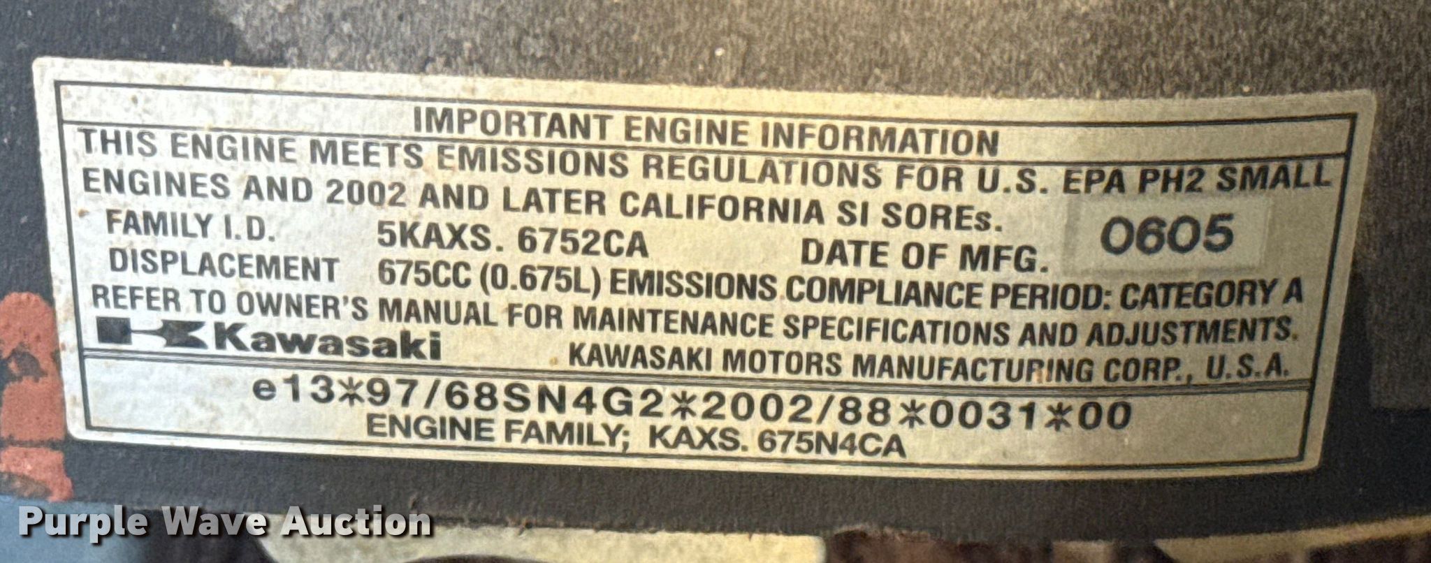 John Deere 727A ZTR lawn mower. Hours: Unknown, Cutting width: 54". Engine Kawasaki, Displacement: 675 cc, Cylinders: 2, Fuel type: Gas, HP: 23. Transmission Hydrostatic. Operators station OROPS, Canopy. Tires Front: 13.50X5.00-6, Rear: 23X9.50-12. Notes Dead battery, Frame damage, cracked , Flat tires, Non-operational unit. Oklahoma Department of Wildlife Conservation. 14112 Slaughterville Road. Lexington, OK 73051