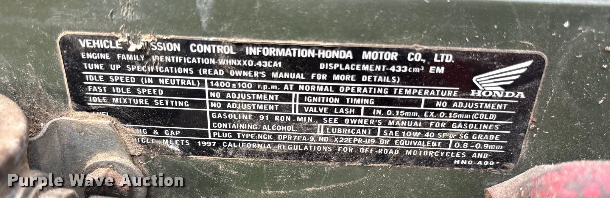 Purple Wave is selling a used ATV in Oklahoma. This item is a 2000 Honda TRX450S ATV with the following: Miles: 8,038 on odometer, VIN: 478TE2205Y4119005
