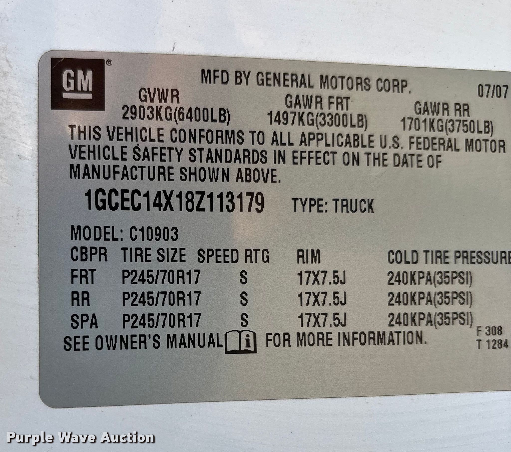 2008 Chevrolet Silverado pickup truck. Miles: 190,470 on odometer, VIN: 1GCEC14X18Z113179, Unit #: 24. Engine Displacement: 4.3L, Cylinders: 6, Fuel type: Gas. Transmission Automatic. Interior AC, Heat, Cruise control. Tires Size: 245/70R17. Notes Dash warning indicator: Check engine, TPMS. Missouri title. Title distribution may be delayed up to 14 days from verification of funds. Buchheit Logistics. Scott City, MO 63780
