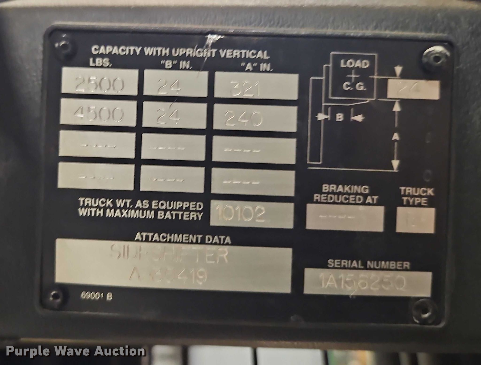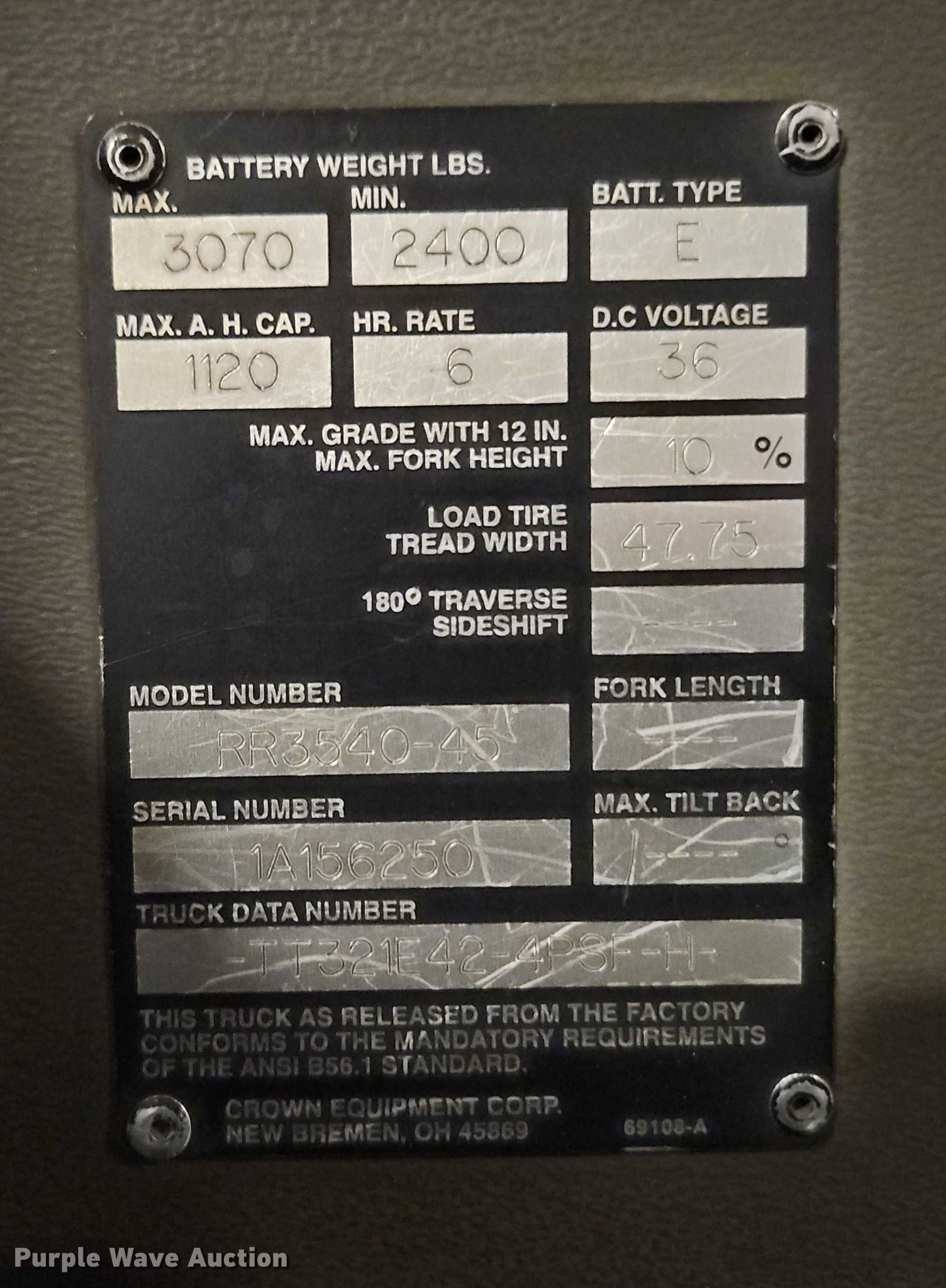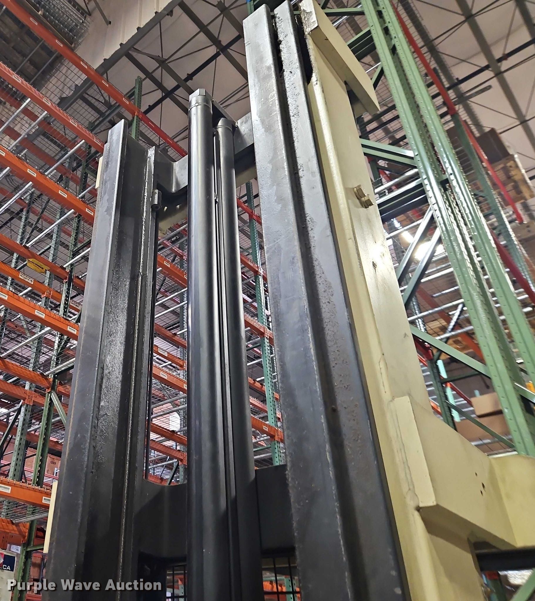 Crown RR3540-45 forklift. Hours: Unknown, Serial: 1A156250. Electric Motor Volts: 36. Transmission Hydrostatic. Features Maximum lift capacity: 4,500 lbs, Maximum lift height: 321", Collapsed mast height: 140", Mast stages: 3, Side shift, Mast tilt, Reach / retract, Fork length: 60". Notes Dead battery. Fry-Wagner Moving & Storage. Lenexa, KS 66219