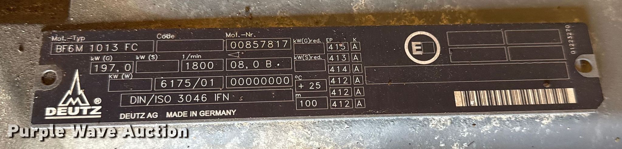 2004 Generac 3769720100 generator. Hours: Unknown, Serial: 2075690. Engine Deutz Diesel BF6M, Serial: 00857817, Cylinders: 6, Fuel type: Diesel, kW: 197. Features Generator kVA: 163, kW: 130, Phase: Three, Electric start. Notes Dead battery, Unknown operating condition. Collinsville, OK 74021