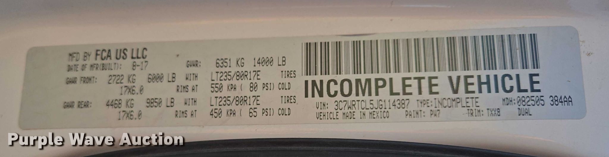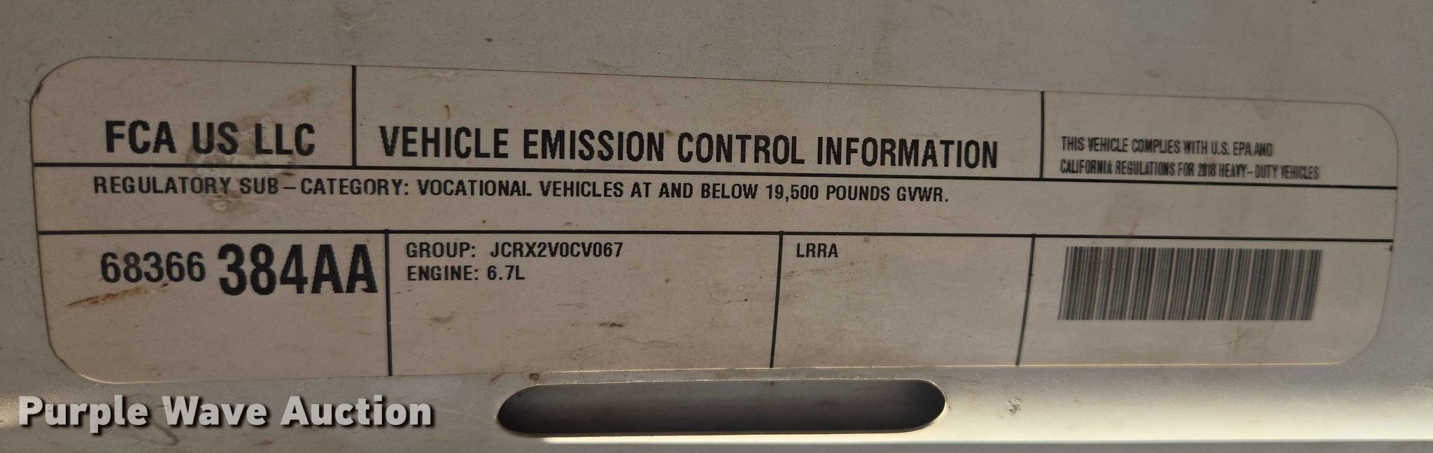 2018 RAM 3500HD Crew Cab truck cab and chassis. Miles: 262,798 on odometer, Hours: 3,909 on meter, VIN: 3C7WRTCL5JG114387. Engine Displacement: 6.7L, Cylinders: 6, Fuel type: Diesel. Transmission Automatic, Four wheel drive. Interior AC, Heat, Heated mirrors, Power windows, Power locks, Cruise control, Auxiliary controls, Brake controller. Tires Size: 235/80R17. Notes Dash warning indicator: Water in fuel, Hail damage. Nebraska title. Title distribution may be delayed up to 30 days from verification of funds. Kirk Barnes Const. Inc.. Valentine, NE 69201