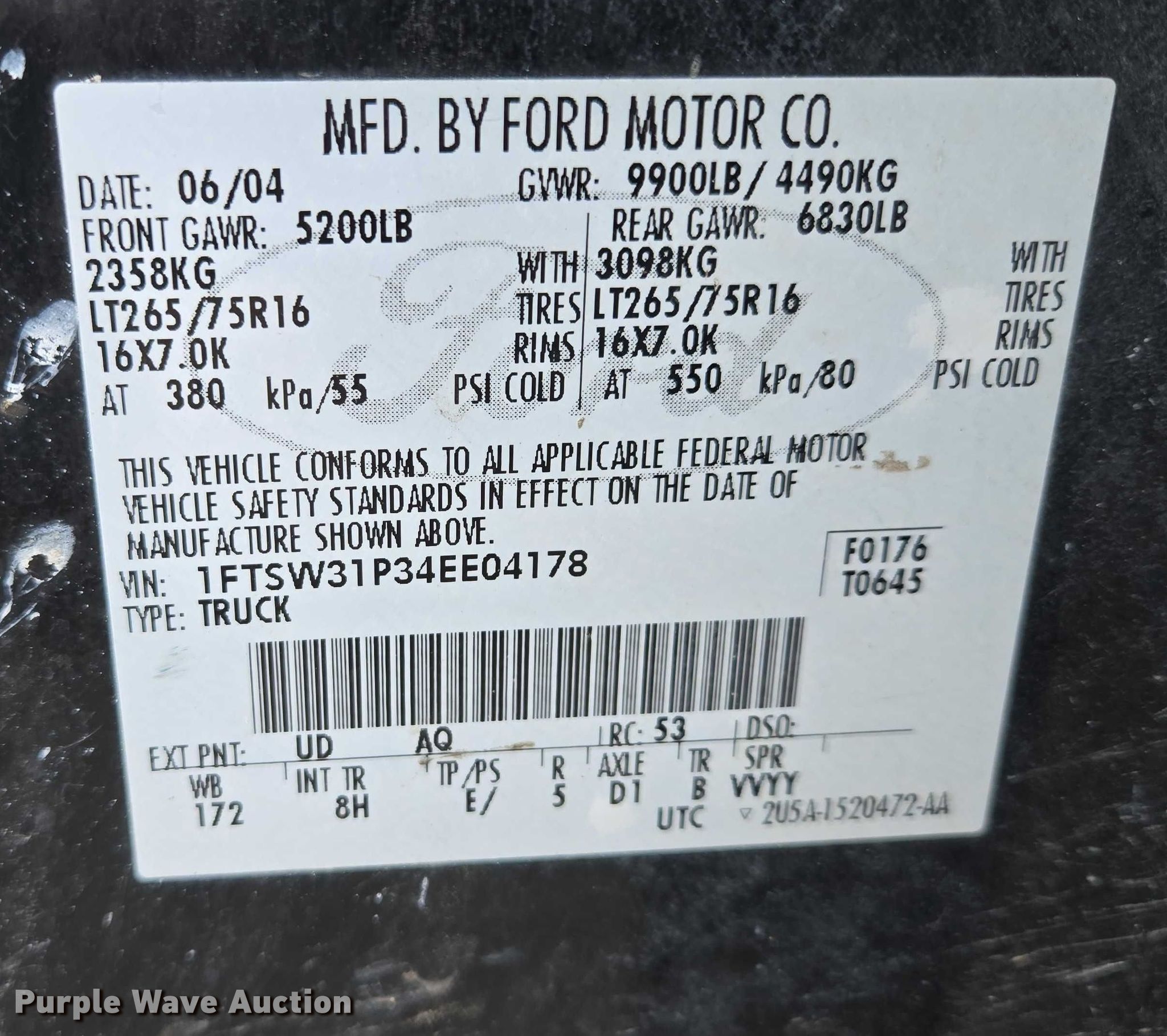 Purple Wave is selling a used 3/4 or 1 Ton Pickup or Van in Nebraska. This item is a 2004 Ford F350 Super Duty Crew Cab flatbed truck with the following: Miles: 241,743 on odometer, VIN: 1FTSW31P34EE04178