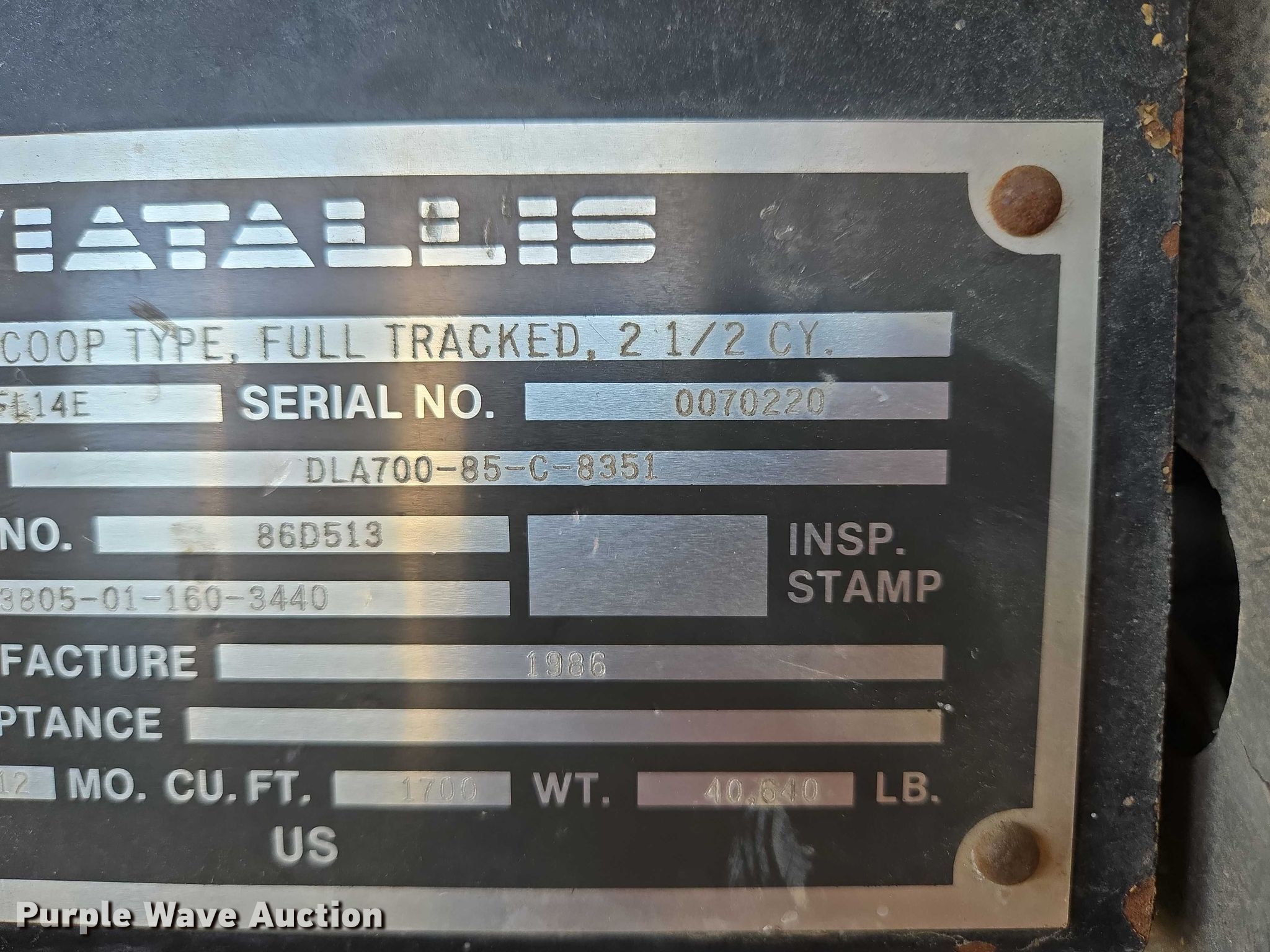 Purple Wave is selling a used Crawler Loader in South Dakota. This item is a 1986 Fiatallis FL14E track loader with the following: Hours: 272 on meter, Actual hours: Unknown, Serial: 0070220