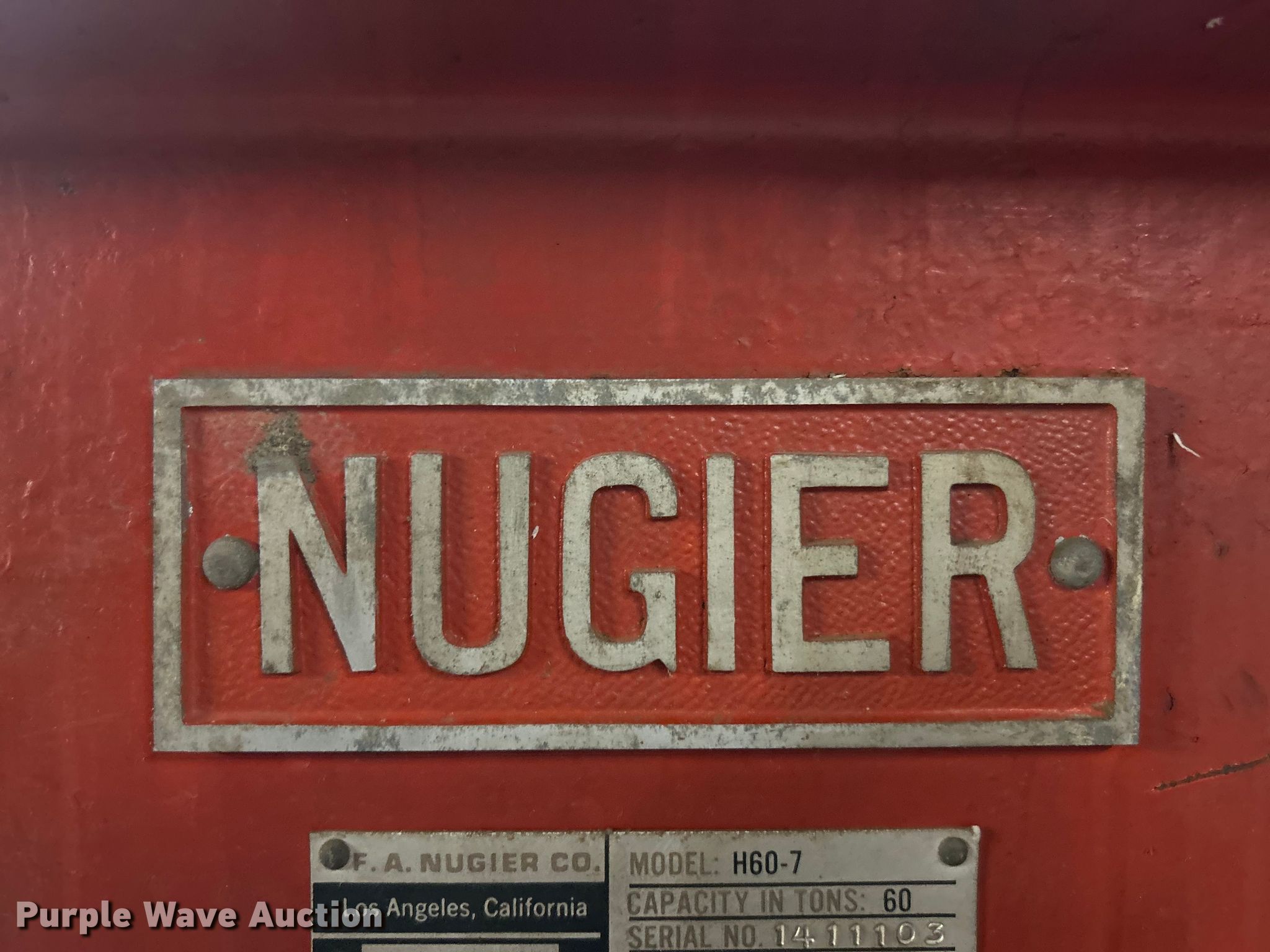F.A. Nugier H60-7 hydraulic press. Serial: 1411103, Capacity: 60 tons, Plates included. Buyer responsible for all aspects of removal.. Big Boy's Steel Erection. Hazelwood, MO 63042