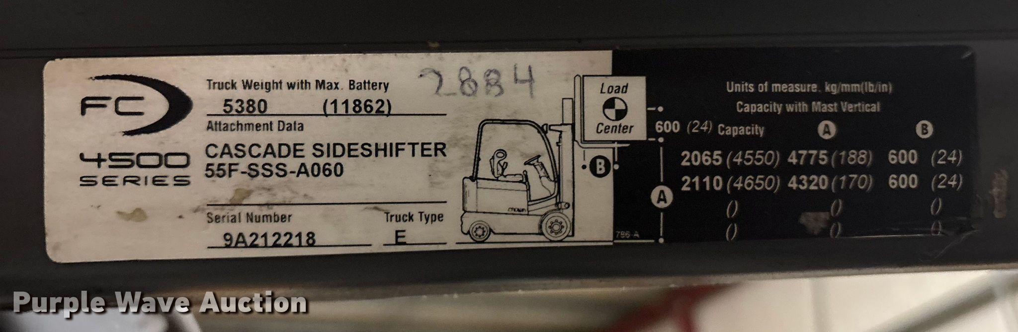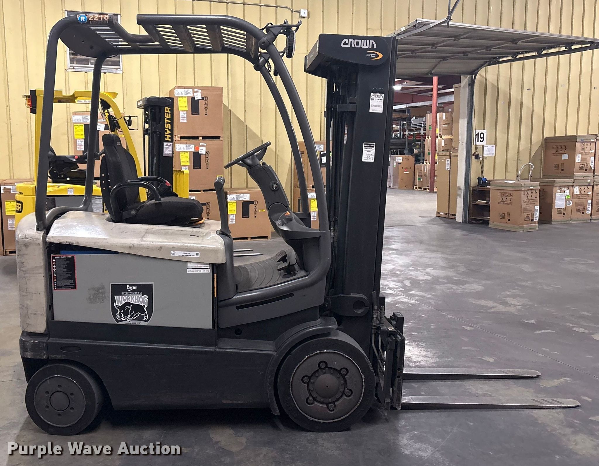 Purple Wave is selling a used Warehouse Forklift in Massachusetts. This item is a 2014 Crown FC4525-50 forklift with the following: Hours: 9,636 on meter, Serial: 9A212218, Unit #: SFS2774