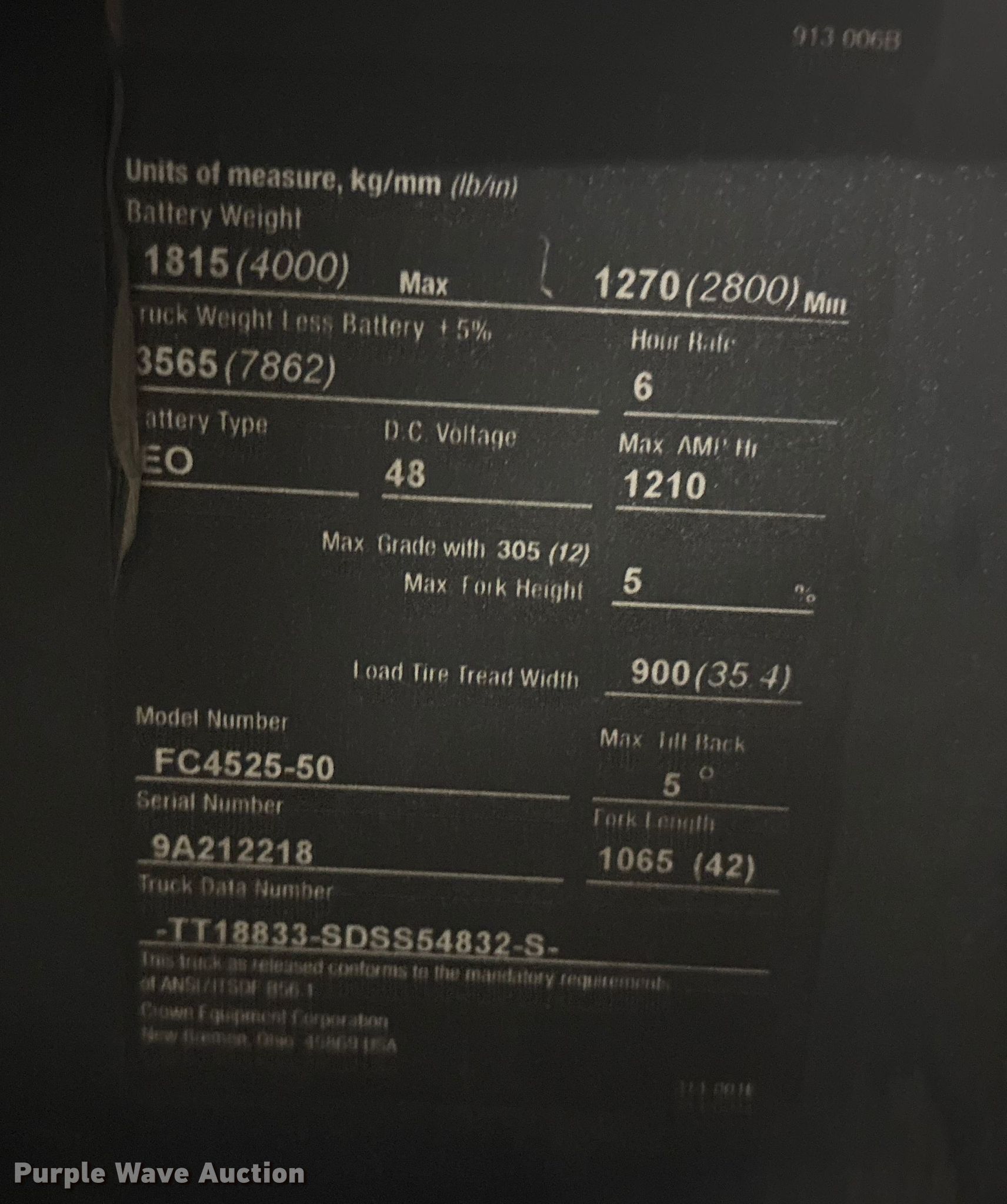 2014 Crown FC4525-50 forklift. Hours: 9,636 on meter, Serial: 9A212218, Unit #: SFS2774. Electric Motor Volts: 48, Charger: Three phase. Transmission Electric drive. Features Maximum lift capacity: 4,650 lbs, Maximum lift height: 188", Collapsed mast height: 82", Mast stages: 3, Side shift, Mast tilt, Fork length: 42". Tires Front: 21x8x15, Rear: 16x6x10.5, Solid. Ferguson. Barnstable, MA 02601