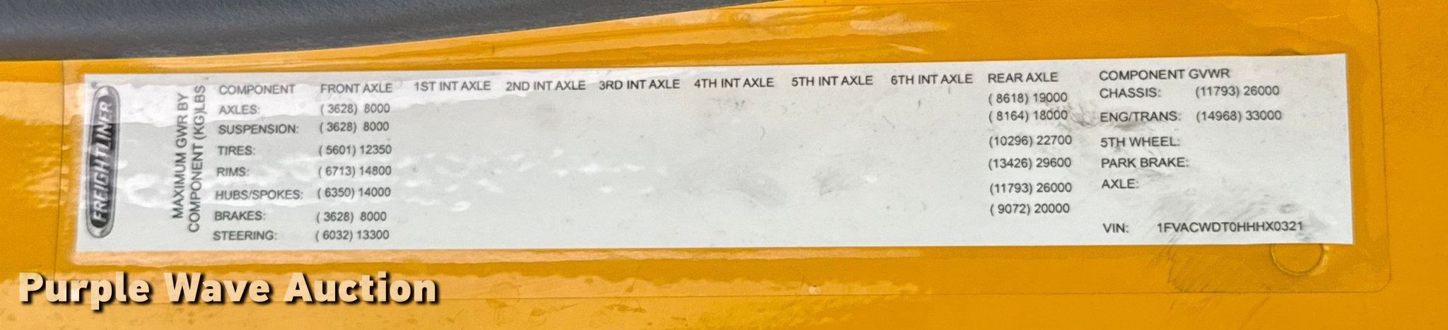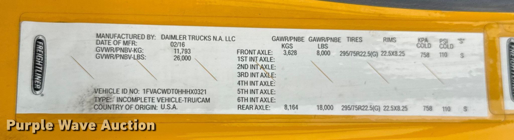 2017 Freightliner Business Class M2 box truck. Miles: 95,124 on odometer, Hours: 4,058 on meter, VIN: 1FVACWDT0HHHX0321. Engine Cummins ISB6.7, Serial: 73949971, Displacement: 6.7L, Cylinders: 6, Fuel type: Diesel. Transmission Automatic. Chassis Axles: Single, Suspension: Air, Brakes: Air, GVWR: 26,000 lbs. Interior AC, Heat, Heated mirrors, Power windows, Power locks, Cruise control, Auxiliary controls. Features Bed Box bed, Morgan GVSD10326102, Serial: MTX47970-002, Length: 27' 6", Width: 104", Height: 9', E-track rail system, Floor: Wood, End gate lift, Anthony, Capacity: 3,500 lbs. Tires Front: 295/75R22.5, Rear: 275/80R22.5. Notes Windshield chipped or cracked, Jump start required during on-site data collection, Possible electrical issues Will not stay running when end lift gate is operated, Unknown operating condition of end gate lift. Oklahoma title. Title distribution may be delayed up to 30 days from verification of funds. Gemini Motor Transport. Oklahoma City, OK 73127