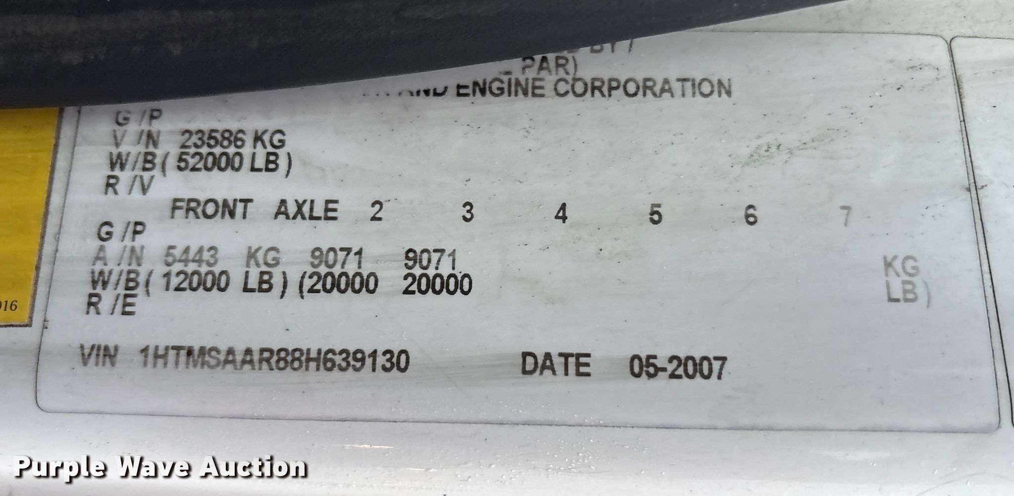 Purple Wave is selling a used Truck Chassis in Indiana. This item is a 2008 International 4400 truck cab and chassis with the following: Miles: 293,585 on odometer, Hours: 10,877 on meter, VIN: 1HTMSAAR88H639130