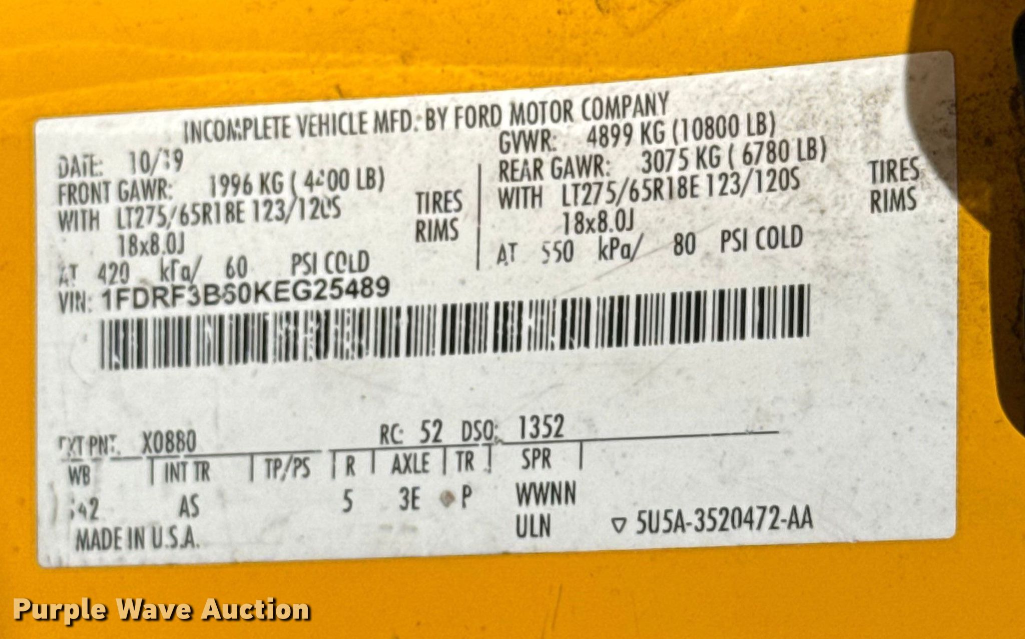 Purple Wave is selling a used 3/4 or 1 Ton Pickup or Van in Oklahoma. This item is a 2019 Ford F350 Super Duty XL utility bed pickup truck with the following: Miles: 169,893 on odometer, VIN: 1FDRF3B60KEG25489, Unit #: 907