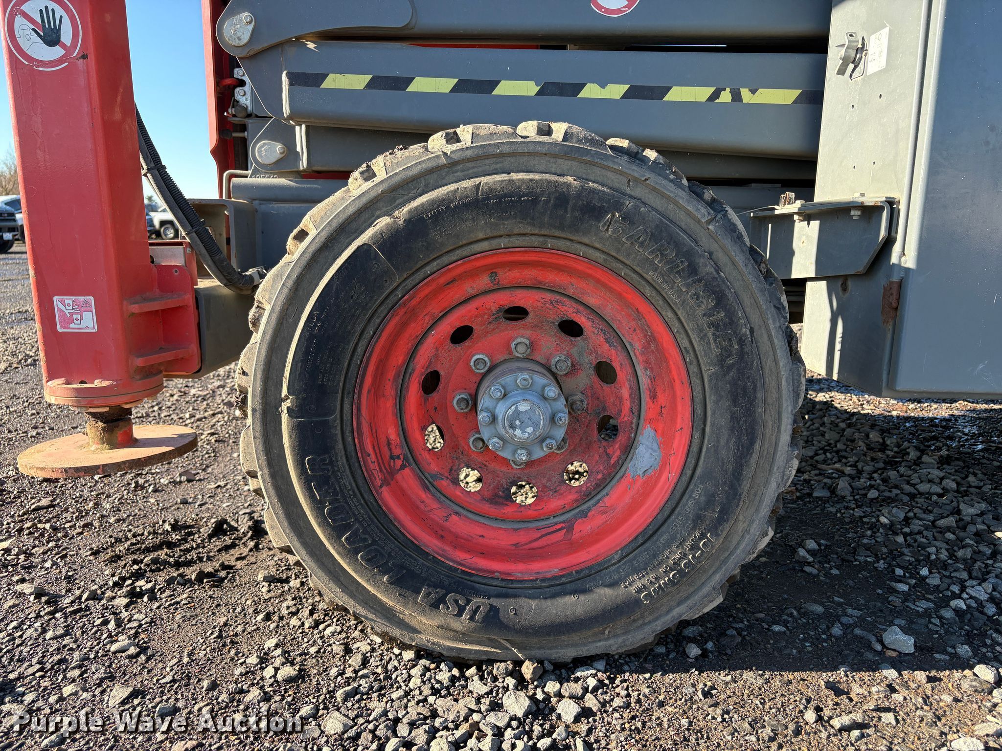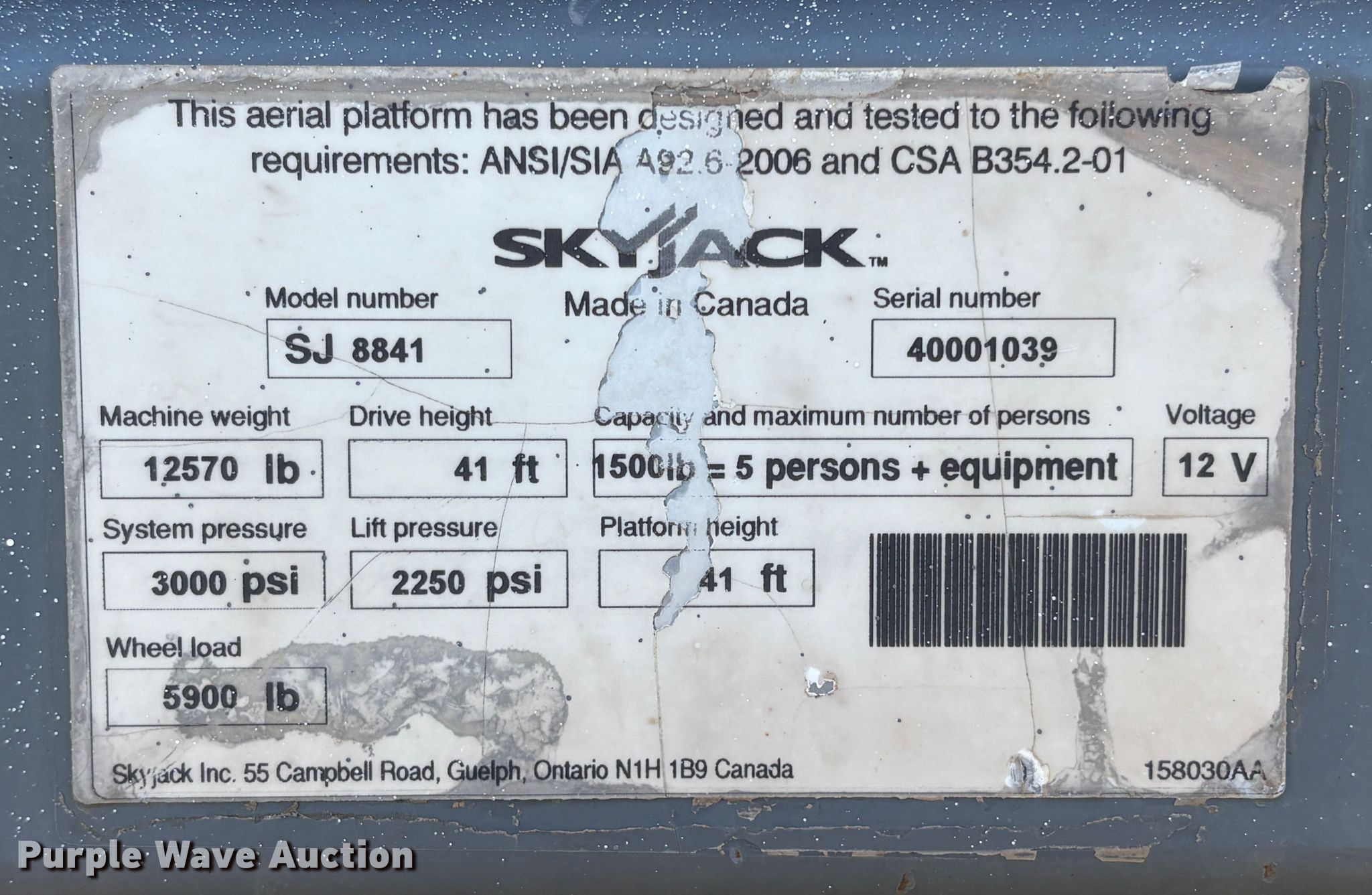 SkyJack SJ8841 RT scissor lift. Hours: 3,248 on meter, Serial: 40001039, Unit #: 95957575. Engine PSI CPSIB1.60GLP, Displacement: 1.6L, Cylinders: 4, Fuel type: Dual fuel LP bottle: Not included. Chassis Four wheel drive. Features Rough terrain, Maximum lift capacity: 1,500 lbs, Maximum lift height: 41', Hydraulic outriggers, Platform: 11" L x 1" W, AC power outlet, Controls: Remote Control, Ground, Platform extensions: Manual, Travel speed: 4 mph, Safety alarm. Tires Tire size: 10-16.5. Notes Jump start required during on-site data collection. Repossessed item, stored at a secured facility. Please review REQUIRED REMOVAL INSTRUCTIONS. Lender Owned. 2885 National Way. Woodburn, OR 97071