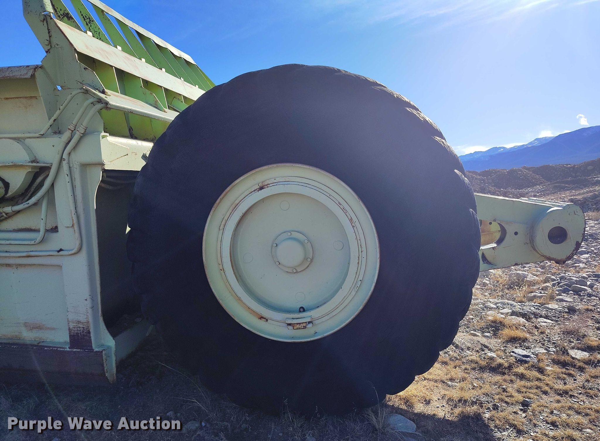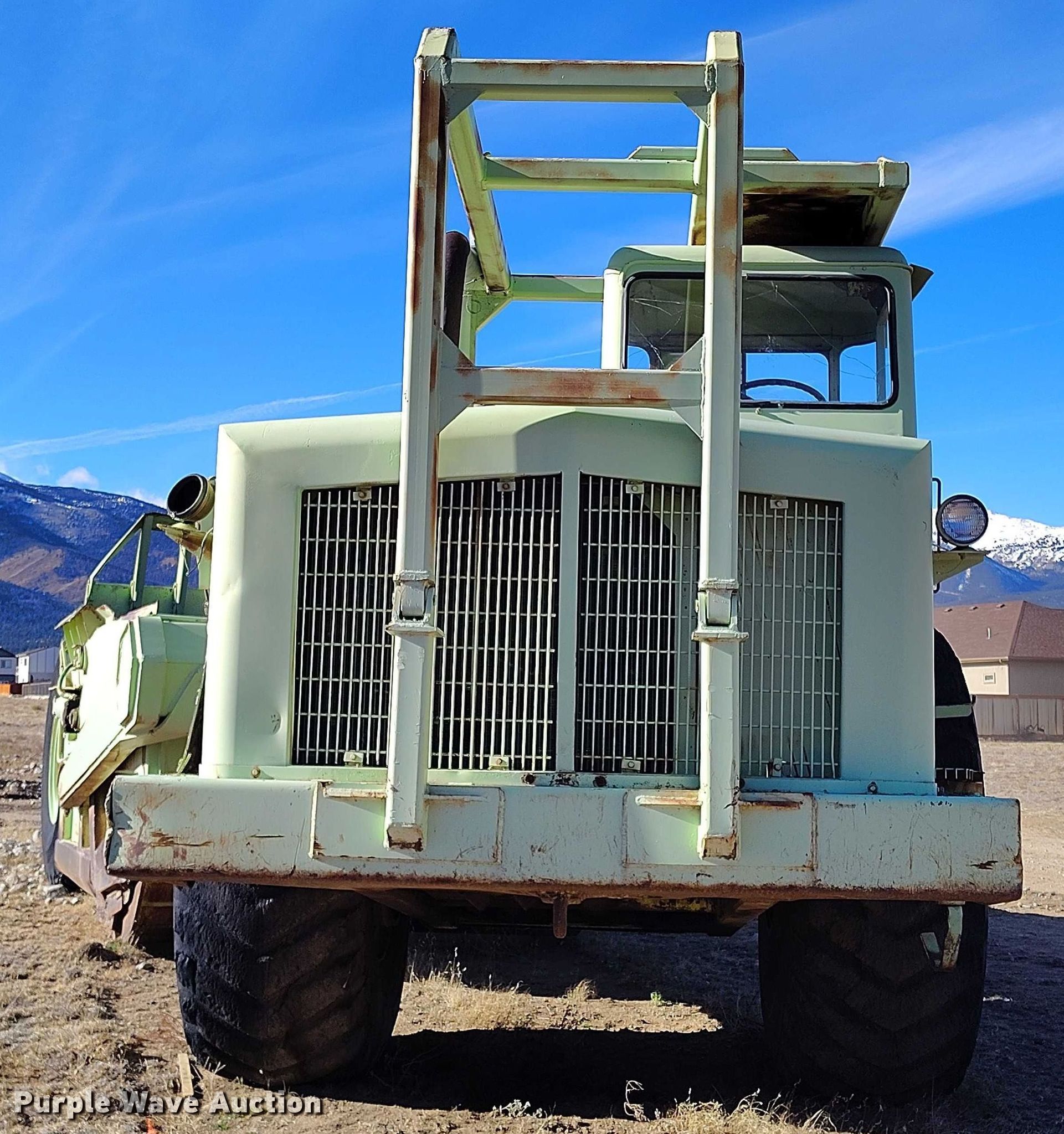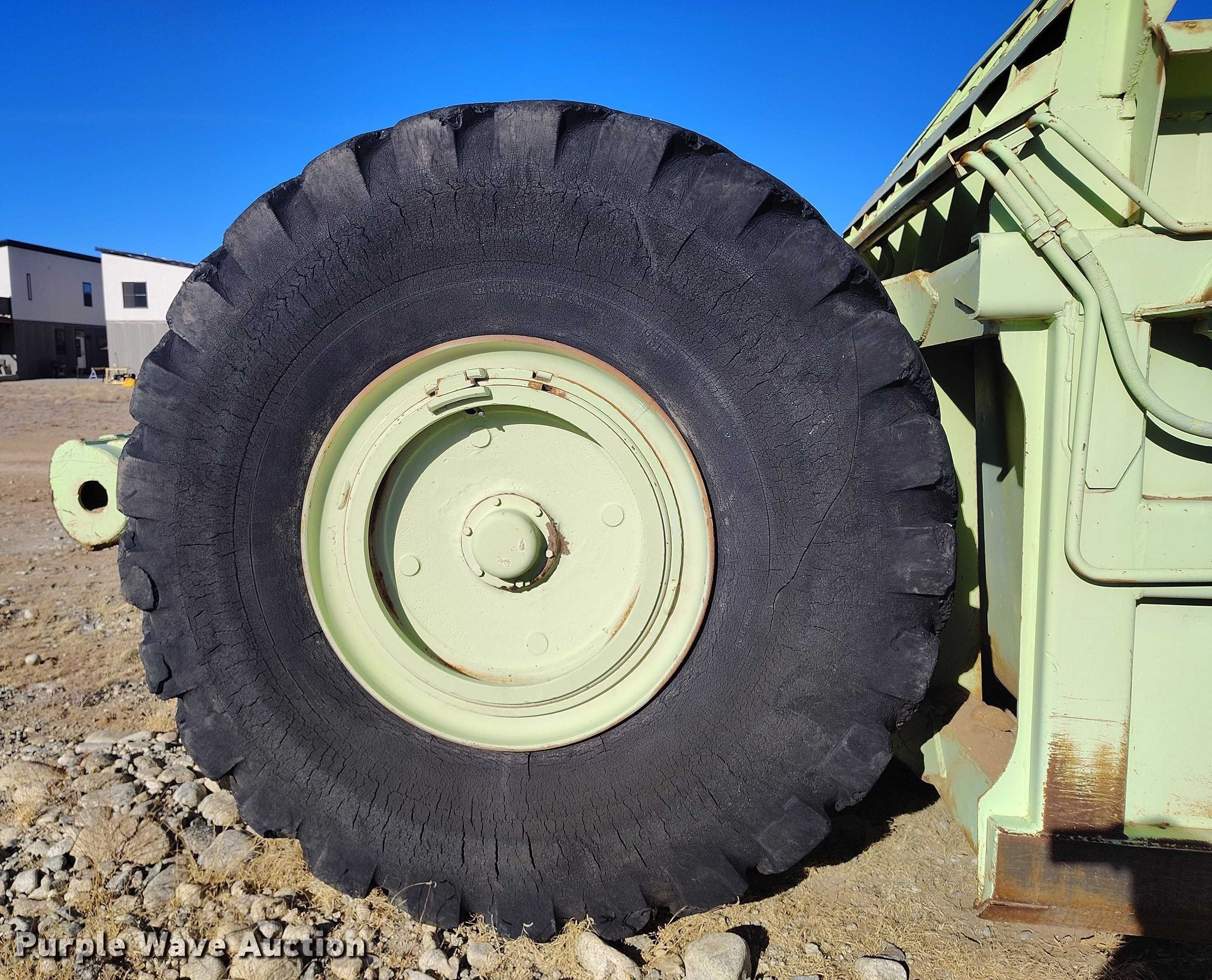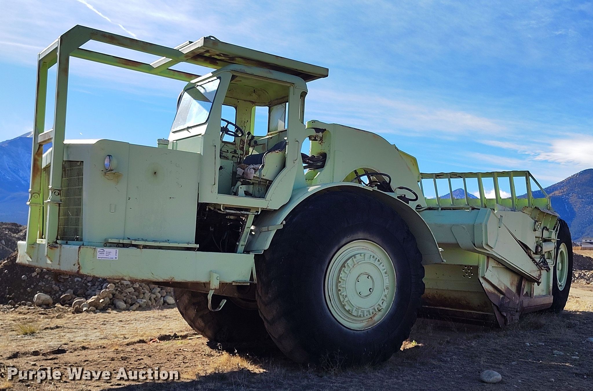 Terex 39LOT conventional scraper. Hours: 4,109 on meter, Serial: 39051. Engine Detroit, Cylinders: 8, Fuel type: Diesel. Transmission Powershift, 6F - 1R. Chassis Brakes: Air. Operators station Enclosed cab. Features Bowl capacity: 24 cu.yd., Hydraulic lift, Scraper controls: Lever controls No. of controls: 3, Rear push block. Tires Size: 27.00-33. Notes Cab door missing, Tires damaged, dry rot, Glass cracked, Non-operational engine , Non-operational unit. Denver East Machinery Company. Buena Vista, CO 81211
