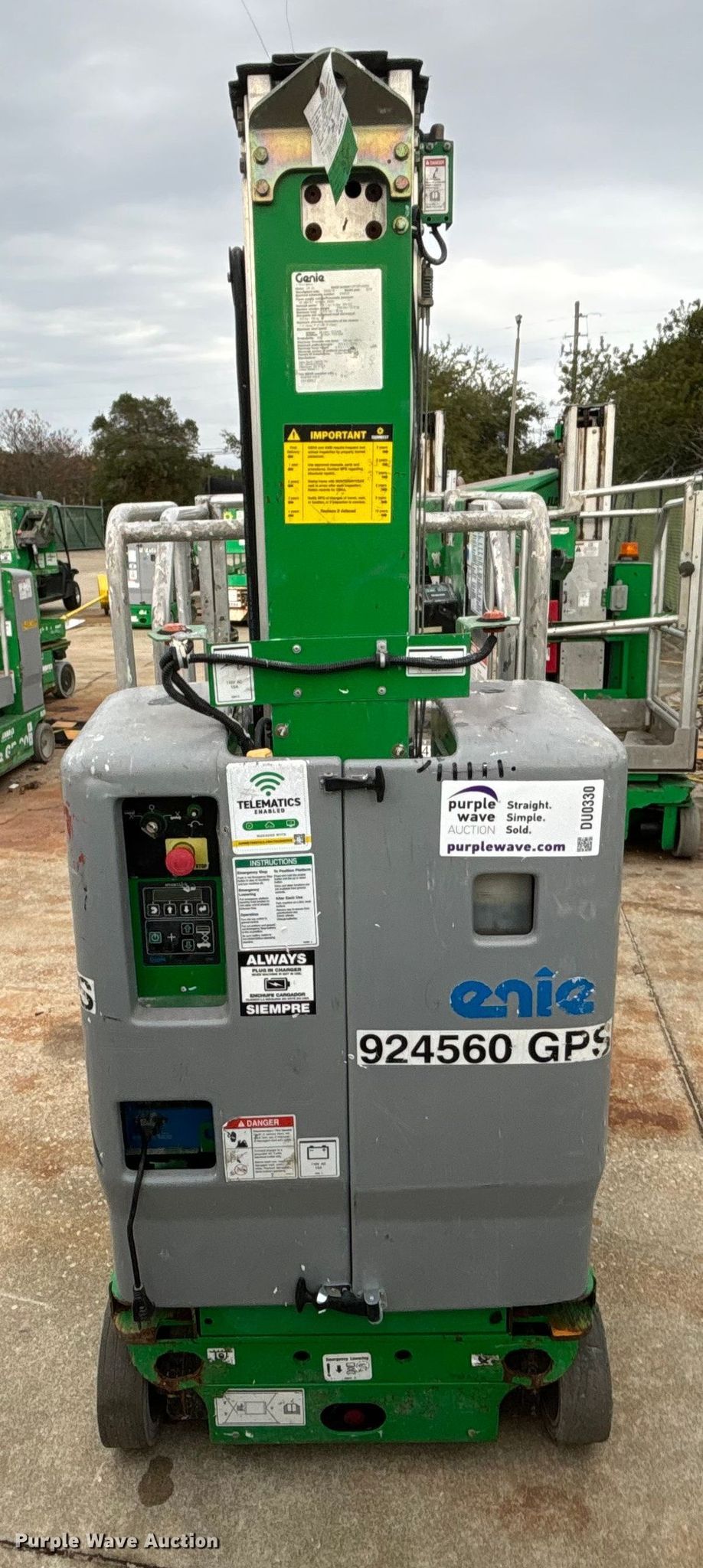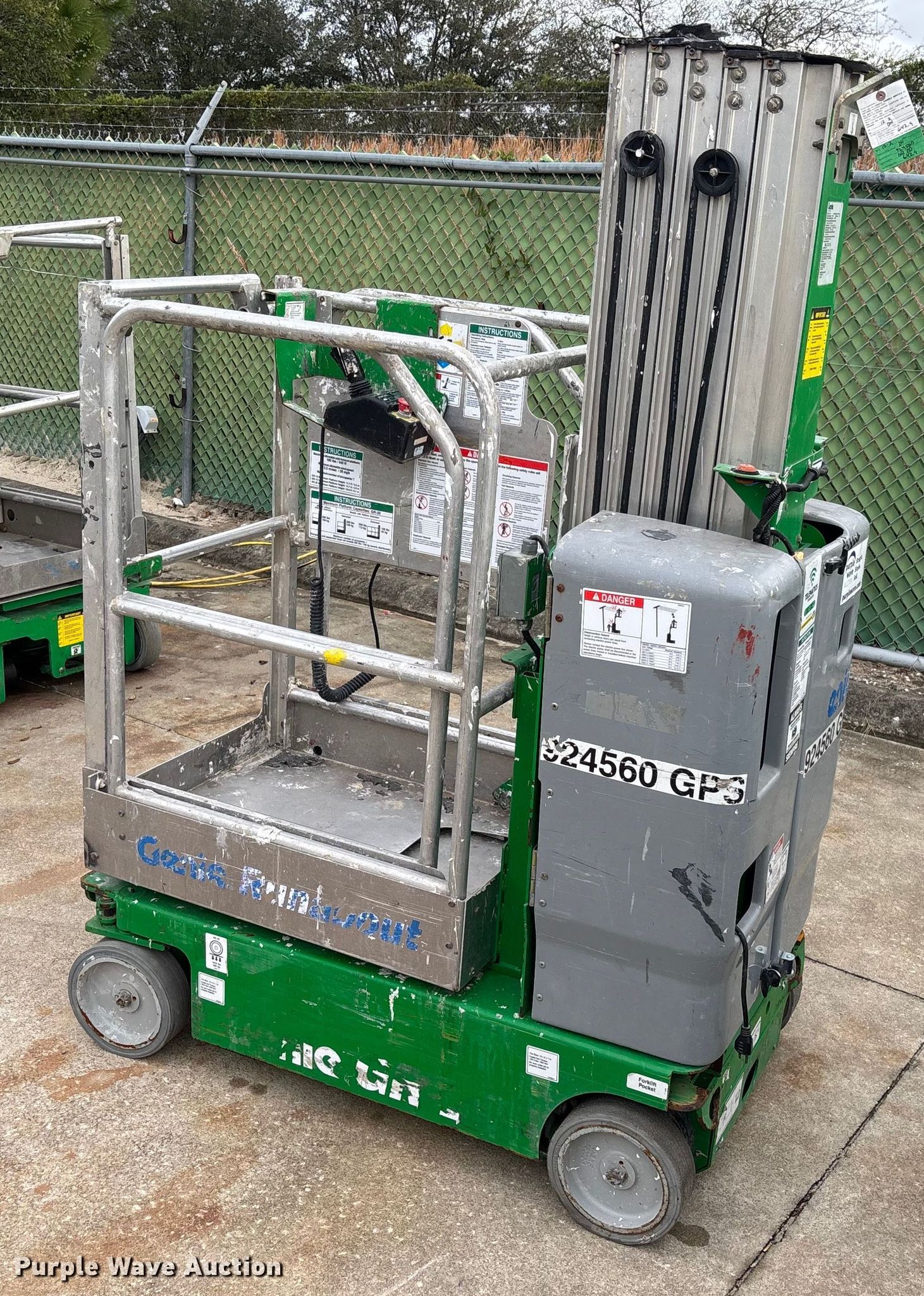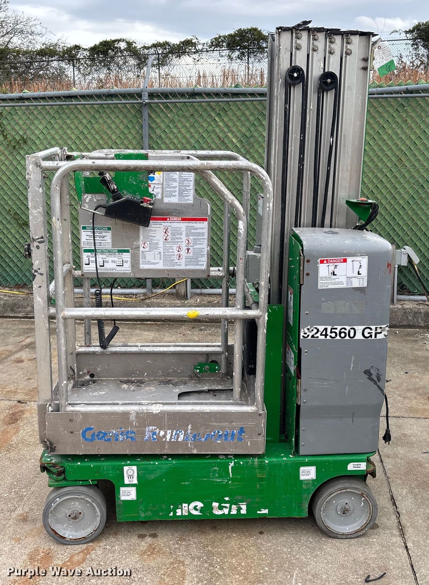 Purple Wave is selling a used Scissor or Vertical Lift in Florida. This item is a 2016 Genie GR-20 vertical lift with the following: Hours: 643 on meter, Serial: GR16P-44864