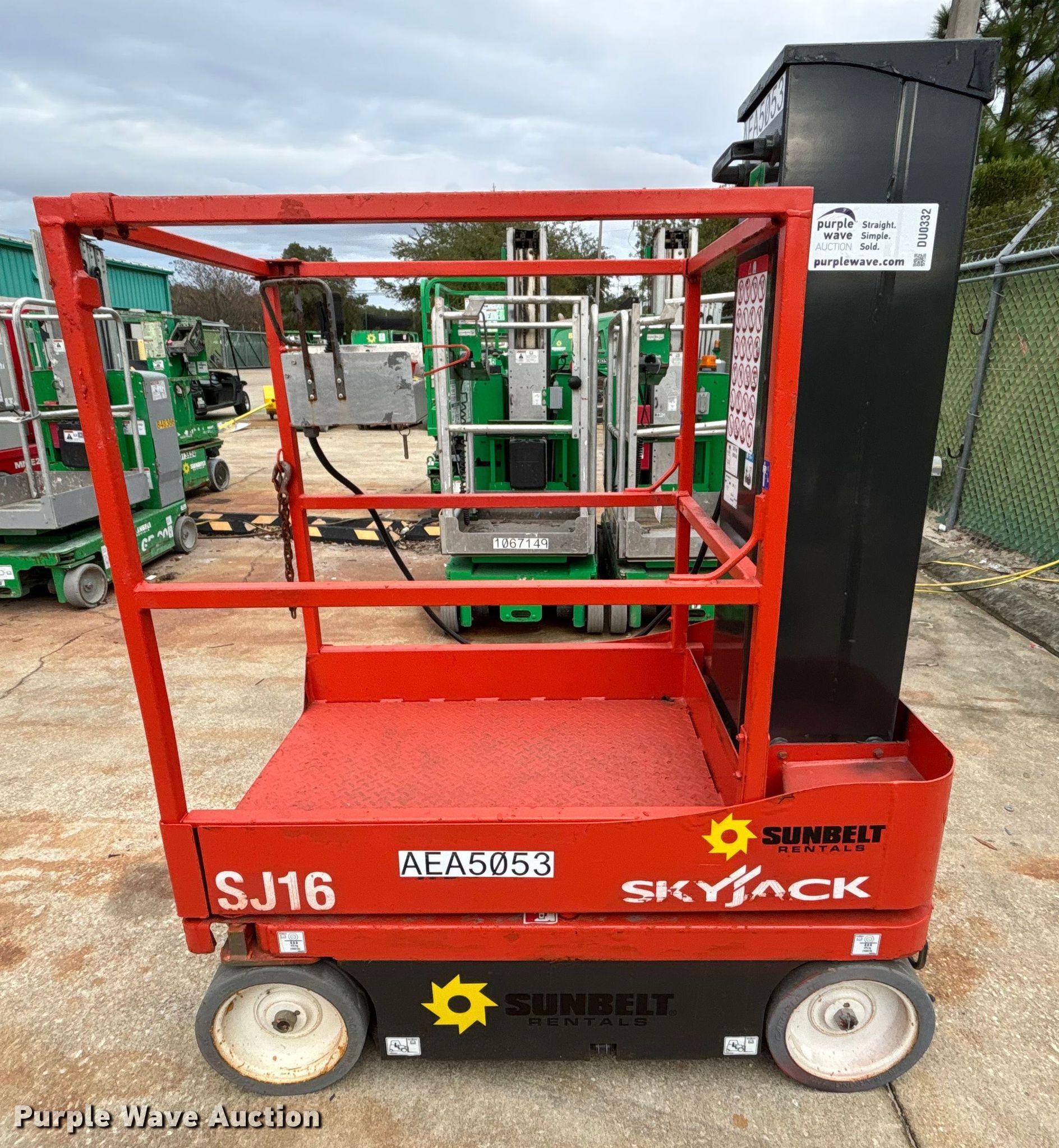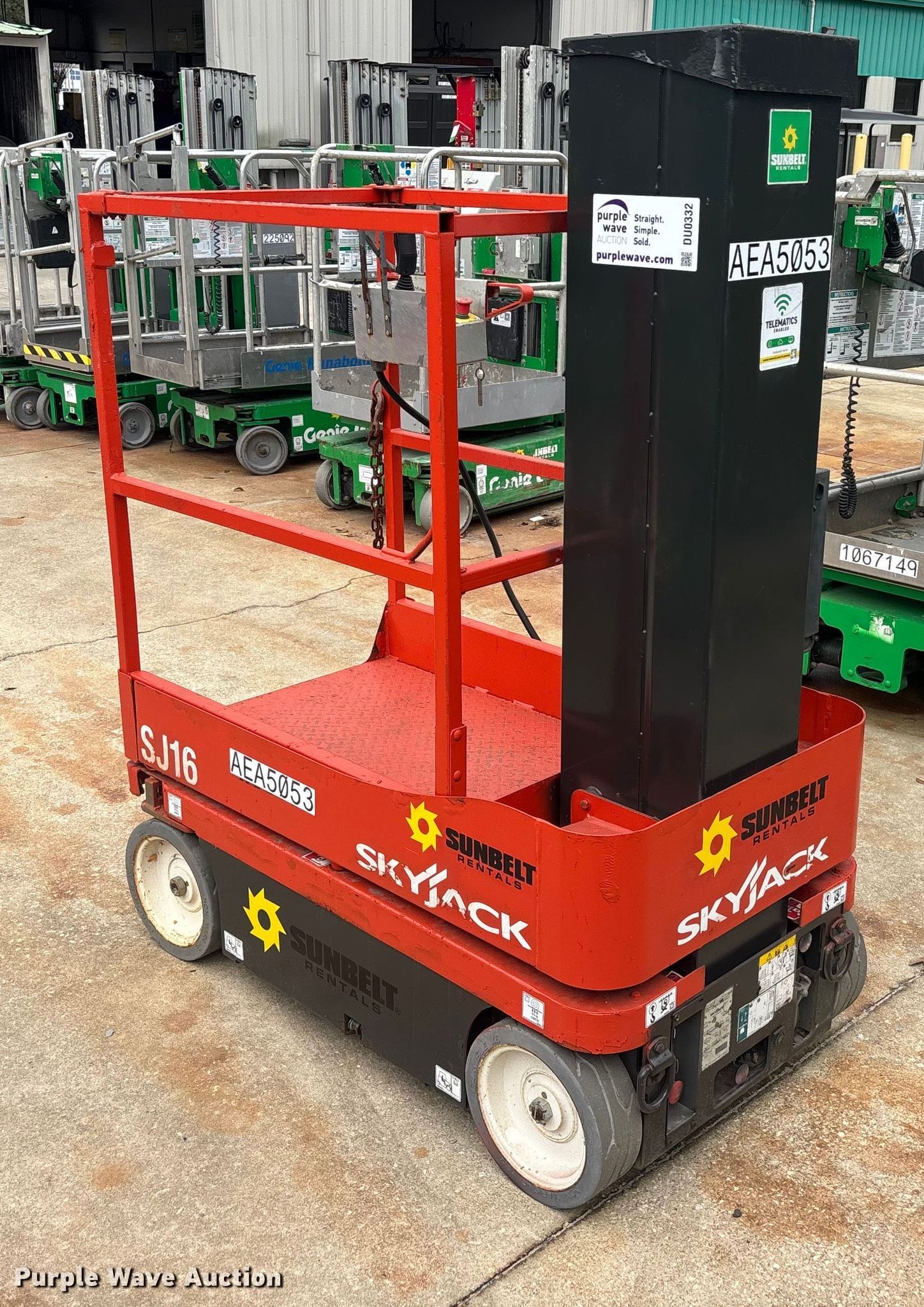 2018 SkyJack SJ16 vertical lift. Hours: 245 on meter, Serial: 14015906. Electric Motor Volts: 24. Features Maximum lift capacity: 500 lbs, Maximum lift height: 16', Controls: Remote Control, Ground, Safety alarm. Tires Tire size: 12x4, Non-marking. Sunbelt Rentals. Jacksonville, FL 32226