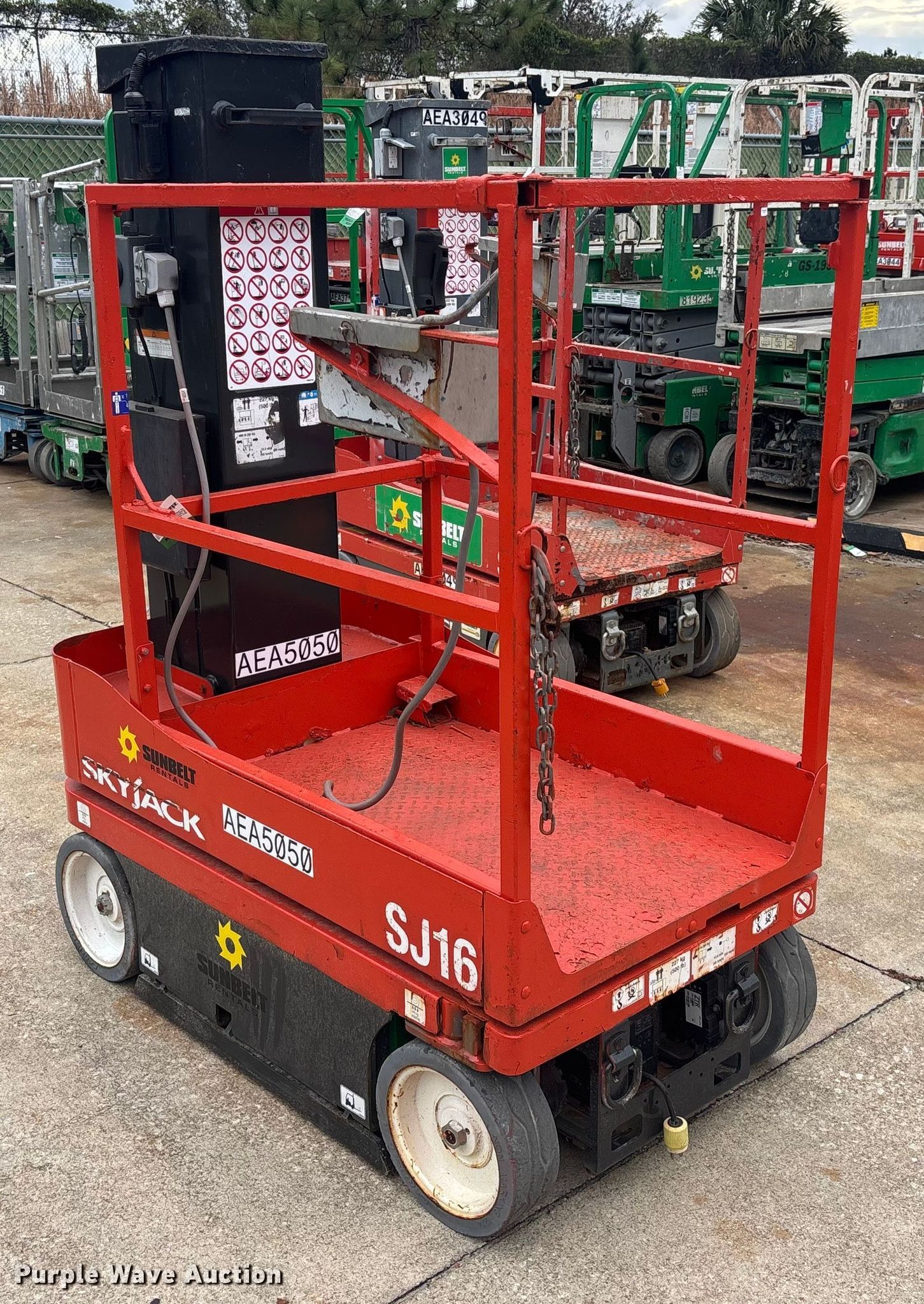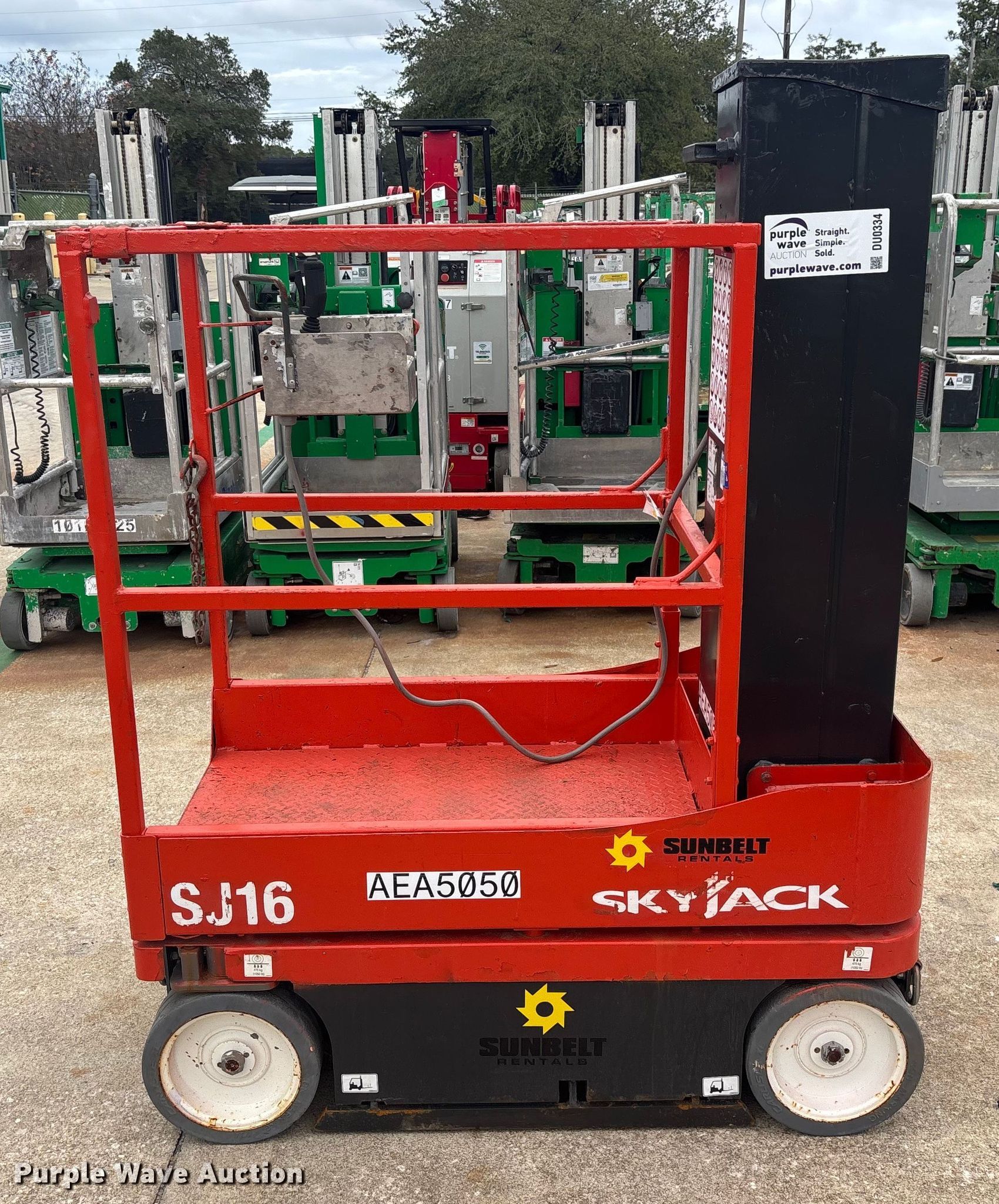 2018 SkyJack SJ16 vertical lift. Hours: 236 on meter. Electric Motor Volts: 24. Features Maximum lift capacity: 500 lbs, Maximum lift height: 16', AC power outlet, Controls: Remote Control, Ground, Safety alarm. Tires Tire size: 12x4, Solid, Non-marking. Sunbelt Rentals. Jacksonville, FL 32226