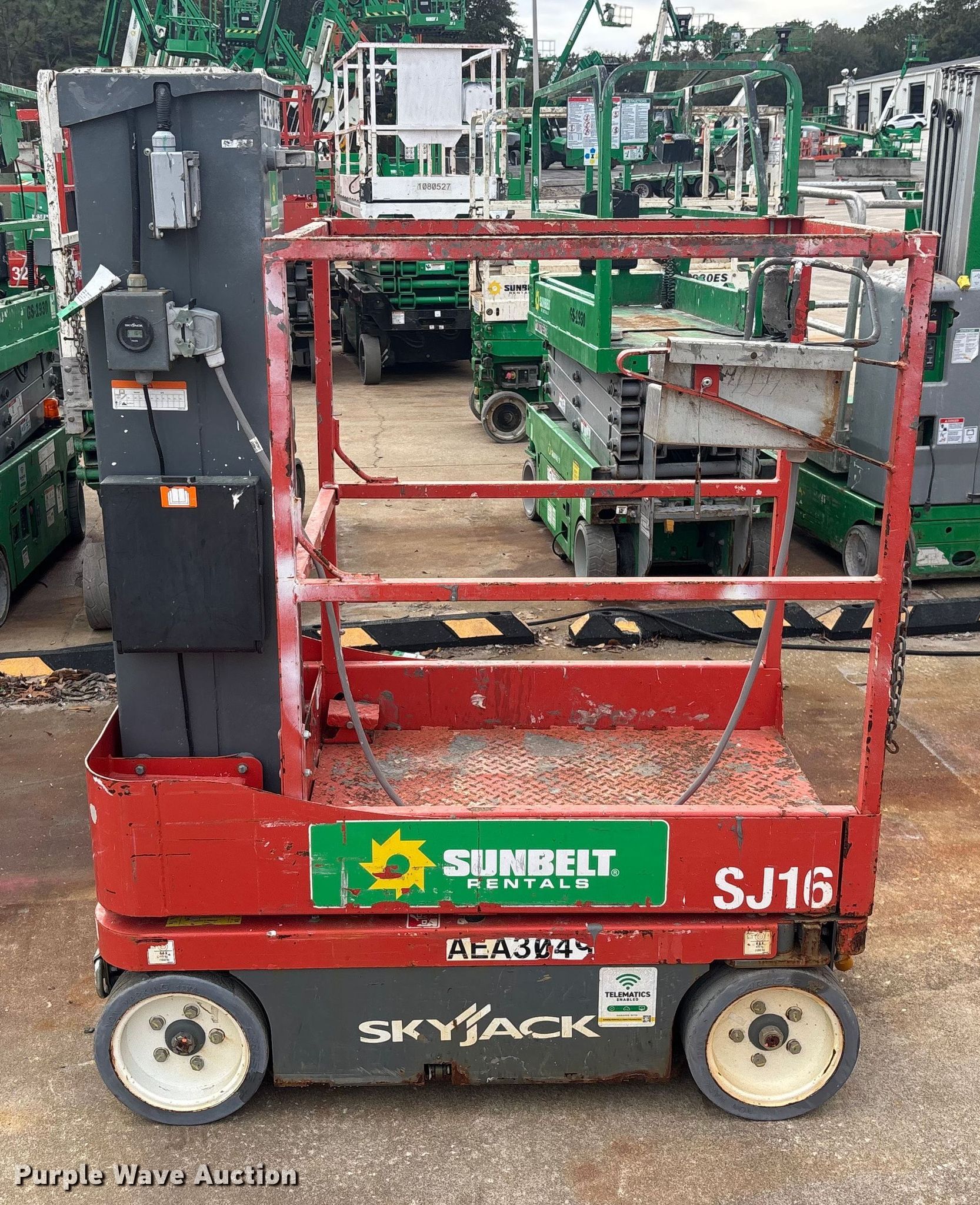 2017 SkyJack SJ16 vertical lift. Hours: 165 on meter, Serial: 14012462. Electric Motor Volts: 24. Features Maximum lift capacity: 500 lbs, Maximum lift height: 16', AC power outlet, Controls: Remote Control, Ground, Safety alarm. Tires Tire size: 12x4, Solid, Non-marking. Sunbelt Rentals. Jacksonville, FL 32226