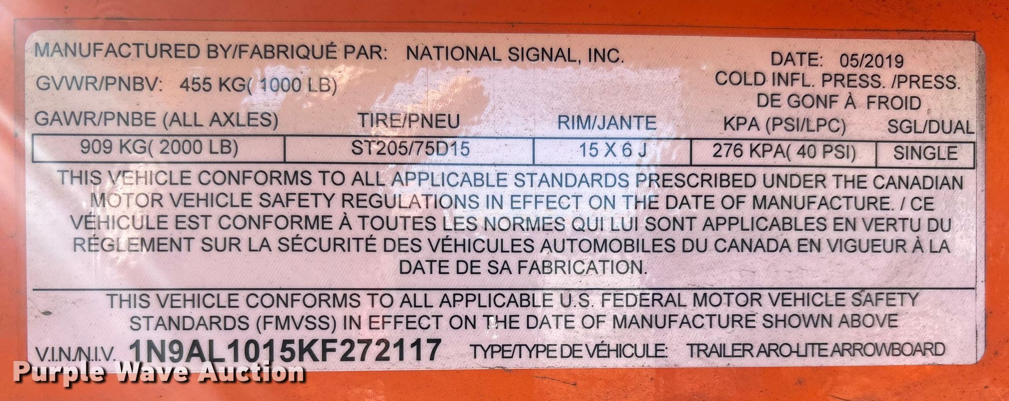 Purple Wave is selling a used Road Safety Equip. in California. This item is a 2019 National Signal arrow board trailer with the following: VIN: 1N9AL1015KF272117