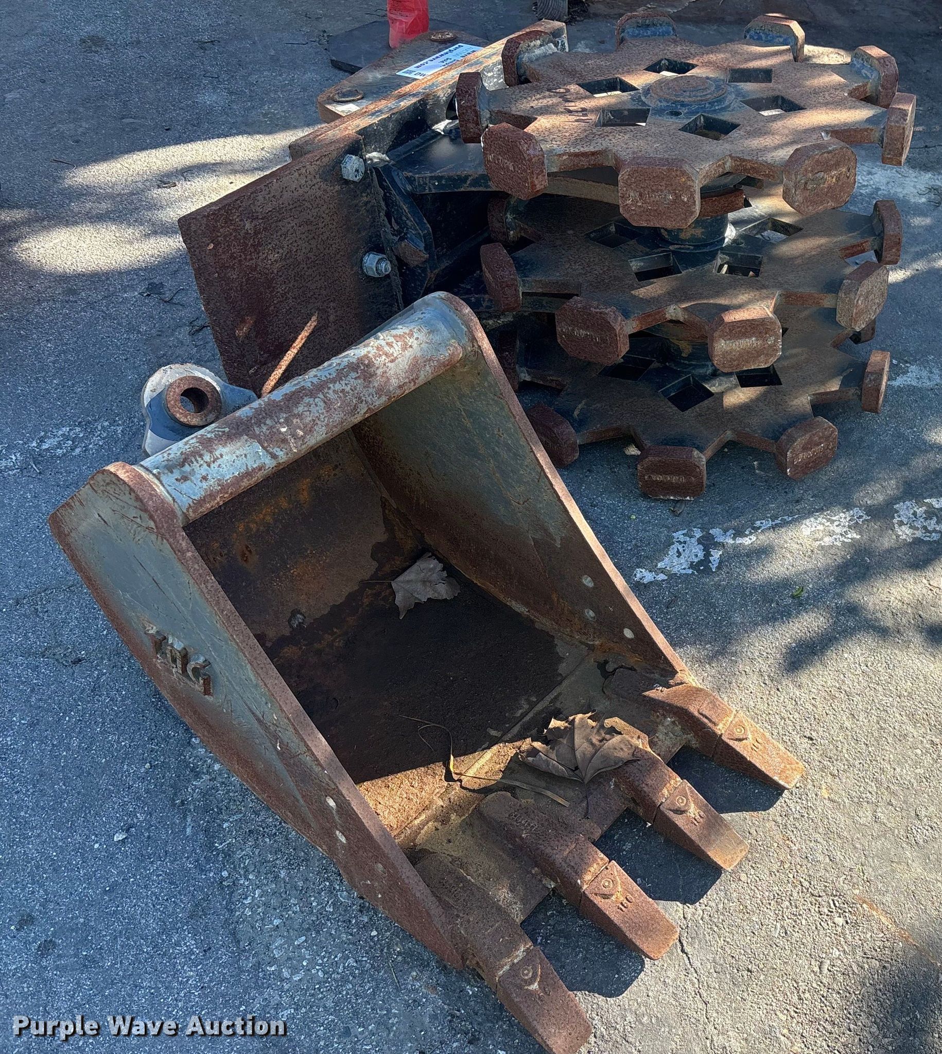 Purple Wave is selling a used Excavator Attach. in California. This item is a (2) excavator attachments with the following: Caterpillar DC-24S compaction wheel, Tag bucket, Width: 16", Teeth: 4