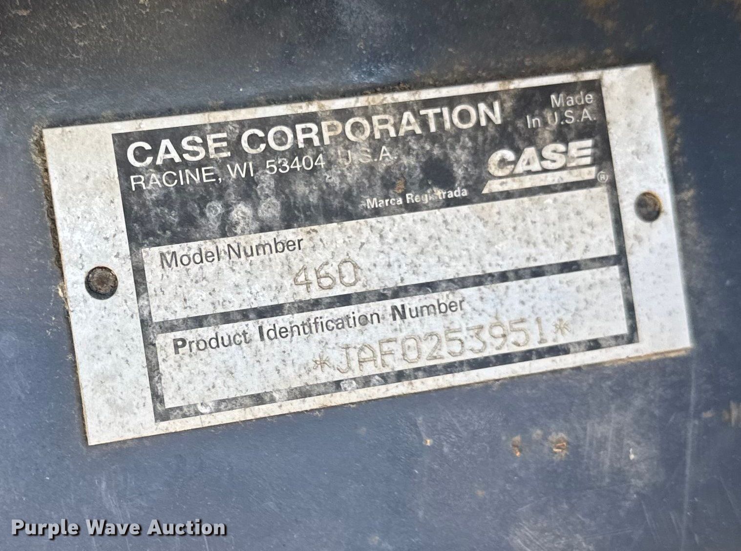 1998 Case 460 trencher. Hours: Unknown, Serial: JAF0253951. Engine Kubota V1505-E, Cylinders: 4, Fuel type: Diesel. Transmission Hydrostatic. Chassis Four wheel drive, Four wheel steer. Features Trencher Model: H939307, Serial: JAF0277675, Estimated dig depth: 77", Teeth: Dirt, Manual crumber, Backhoe Model: D100, Serial: JAF0218381, Bucket width: 12", Backfill blade Width: 62". Tires Size: 29x12.5-15. Notes Hydraulic leaks. Communication Innovators. Pleasant Hill, IA 50327