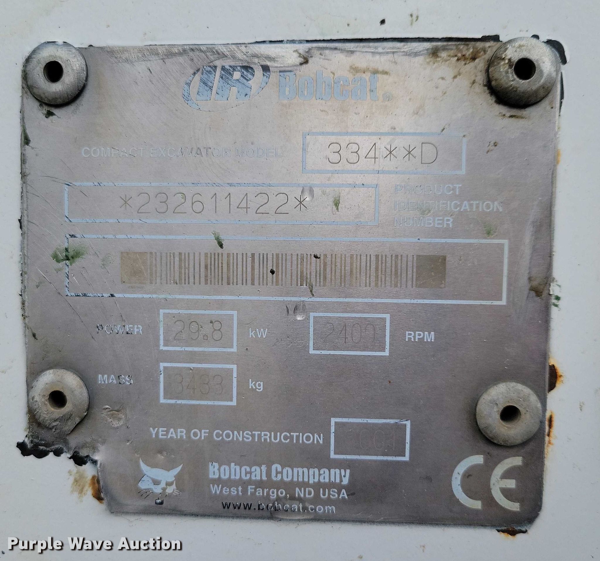 Purple Wave is selling a used Mini Excavator in Iowa. This item is a 2001 Bobcat 334 mini excavator with the following: Hours: 2,160 on meter, Serial: 232611422