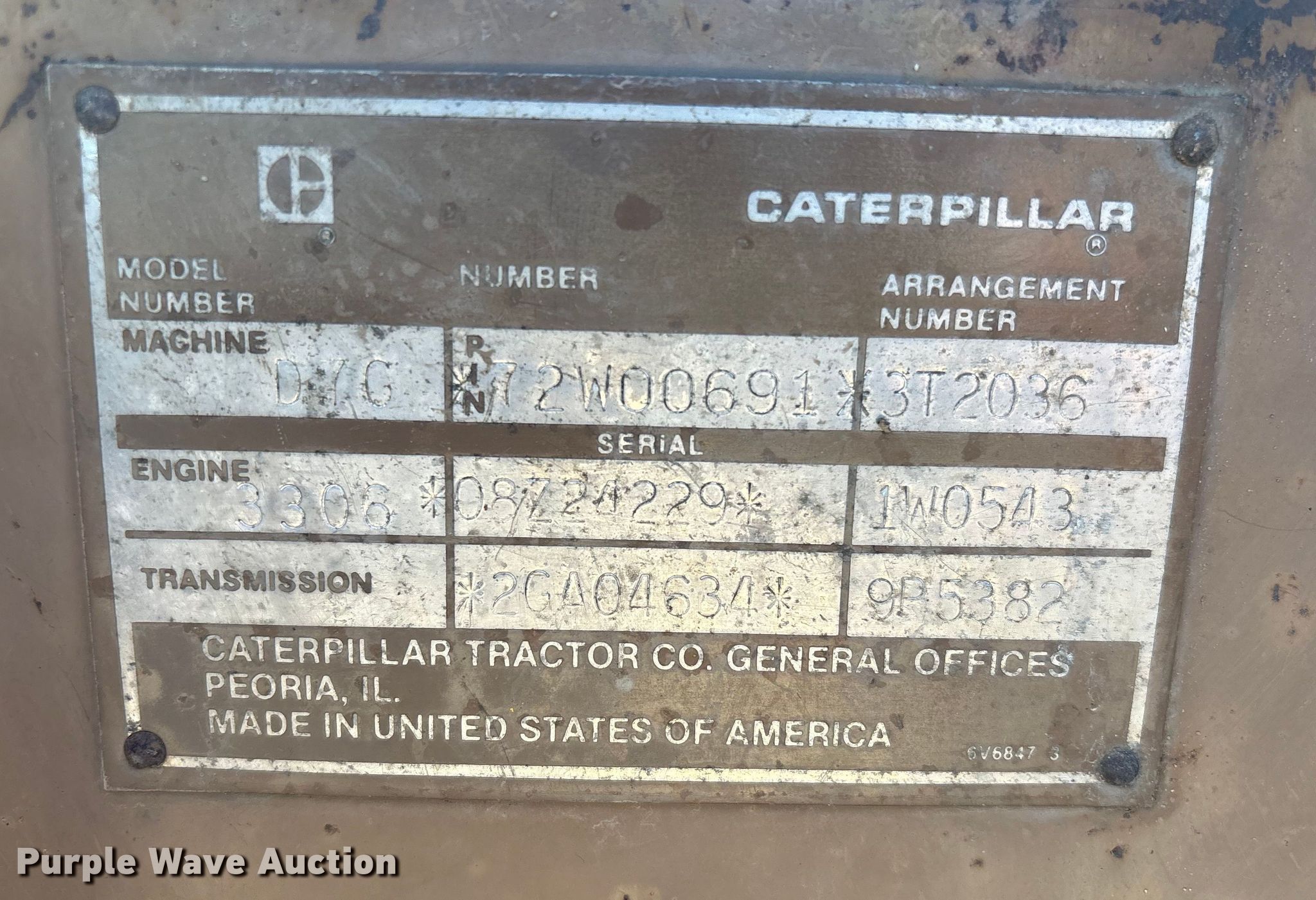 1985 Caterpillar D7G dozer. Hours: Unknown, Serial: 72W00691. Engine Caterpillar 3306, Cylinders: 6, Fuel type: Diesel. Transmission Powershift, 3F - 3R. Operators station Enclosed cab, AC, Heat, Steering: Clutch brake. Features Dozer blade Blade type: Dual-tilt, Blade shape: Straight, Width: 13' 8", Attachments Winch Carco 80.. Tracks Width: 34", Grouser pads: Single, Bottom rollers: 7, Track guards. Notes Glass cracked, Hour meter missing, AC compressor issues, disconnected, Oil leak, Winch missing, Non-operational cable. Sour Lake, TX 77659