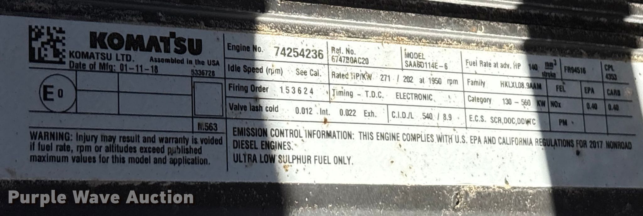 2018 Komatsu PC360LC excavator. Hours: 12,001 on meter, Serial: KMTPC256AHWA36351. Engine Komatsu SAA60114E-6, Displacement: 8.9L, Cylinders: 6, Fuel type: Diesel. Transmission Hydrostatic. Operators station Enclosed cab, AC, Heat, Backup camera. Features Standard, Counter weights, Boom Standard, Stick Stick length: 10', Quick coupler: Hydraulic, Bucket Width: 41", Teeth: 5. Tracks Width: 34", Grouser pads: Triple. Rumsey Construction. Carrollton, TX 75010