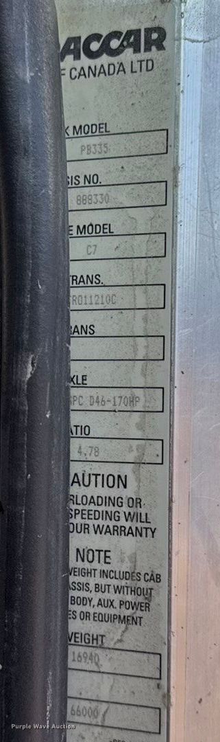 2006 Peterbilt 335 water truck. Miles: 58,985 on odometer, VIN: 2NPLLD0X26M888330. Engine Caterpillar C7, Serial: WAX09575, Displacement: 7.2L, Cylinders: 6, Fuel type: Diesel. Transmission Eaton Fuller, Manual. Chassis Axles: Tandem, Differential lock: Full, Suspension: Spring over walking beam, Brakes: Air, PTO, GVWR: 66,000 lbs. Interior AC, Heat, Cruise control. Features Bed Tank bed, Length: 16', Width: 96", Spray bar: Rear, Side discharge, Top fill, Sight tube, Rear drain: 3". Tires Front: 425/65R22.5, Rear: 11R22.5. Notes Jump start required during on-site data collection, Transmission issues. Missouri title. Title distribution may be delayed up to 30 days from verification of funds. George Shaw Construction. Kansas City, MO 64127