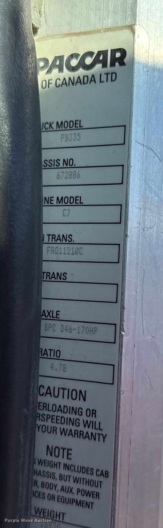 2007 Peterbilt 335 water truck. Miles: 40,573 on odometer, VIN: 2NPLLD0X87M672886. Engine Caterpillar C7, Serial: WAX22179, Displacement: 7.2L, Cylinders: 6, Fuel type: Diesel, HP: 330. Transmission Eaton Fuller, Manual, Speed: 9. Chassis Axles: Tandem, Differential lock: Full, Suspension: Spring over walking beam, Brakes: Air, PTO, GVWR: 66,000 lbs. Interior AC, Heat, Cruise control. Features Bed Tank bed, Length: 16', Width: 96", Spray bar: Rear, Side discharge, Top fill, Sight tube, Rear drain: 3", Rear outlet: 2". Tires Front: 425/65R22.5, Rear: 11R22.5. Missouri title. Title distribution may be delayed up to 30 days from verification of funds. George Shaw Construction. Kansas City, MO 64127