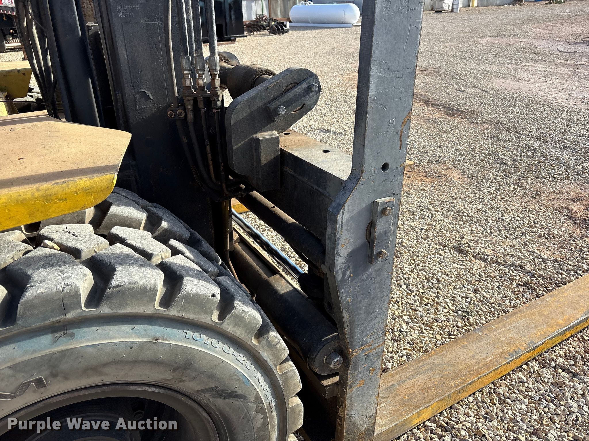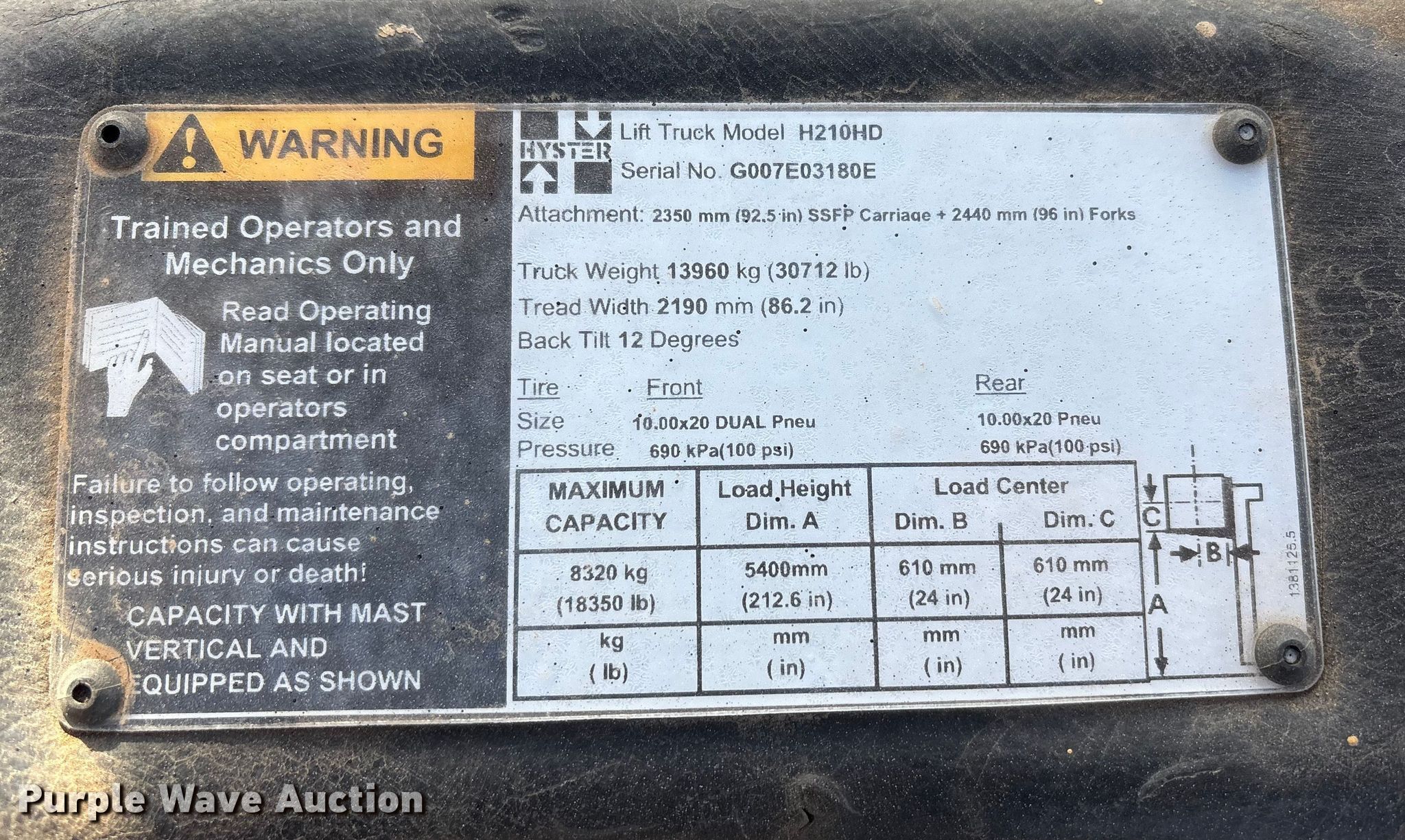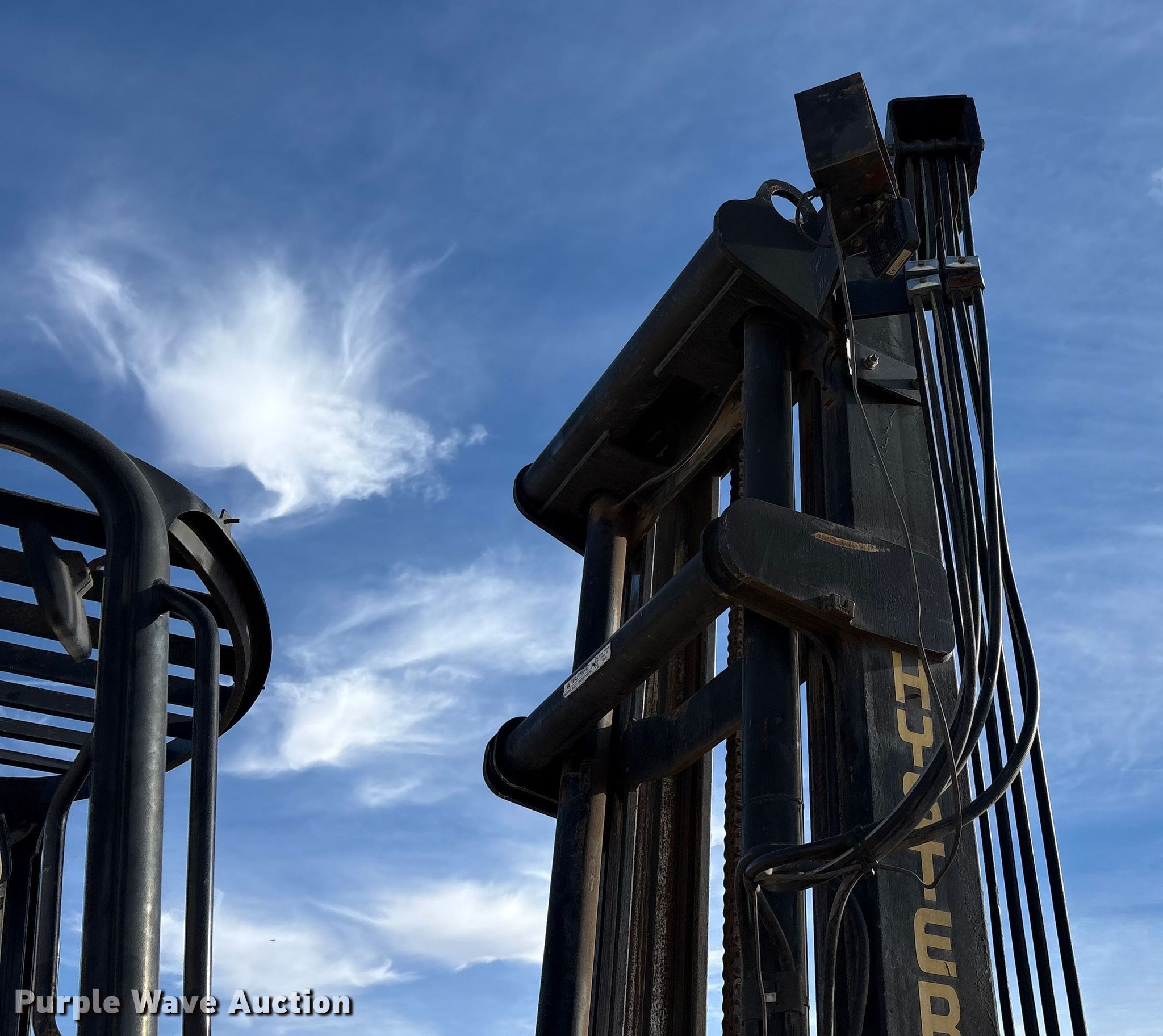 Hyster H210HD forklift. Hours: 10,691 on meter, Serial: G007E03180E. Engine Cummins, Cylinders: 6, Fuel type: Diesel. Transmission Powershift, 4F - 4R. Operators station OROPS. Features Maximum lift capacity: 18,350 lbs, Maximum lift height: 212", Collapsed mast height: 142", Mast stages: 2, Side shift, Mast tilt, Fork positioner, Fork length: 85". Tires Size: 10.00-20NHS, Foam filled. Hargrave Manufacturing. Slaton, TX 79364