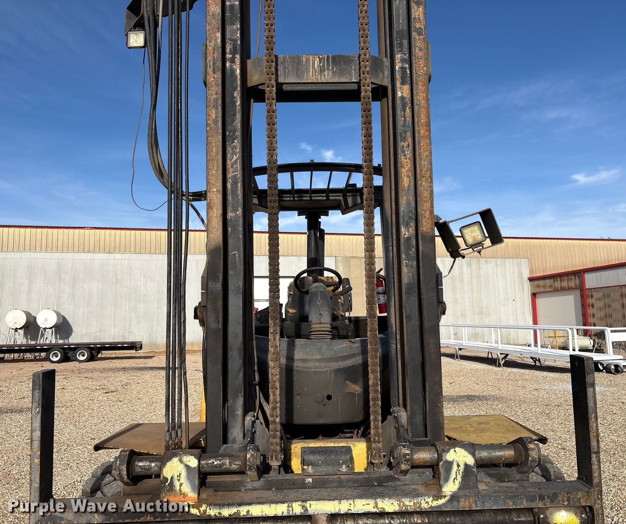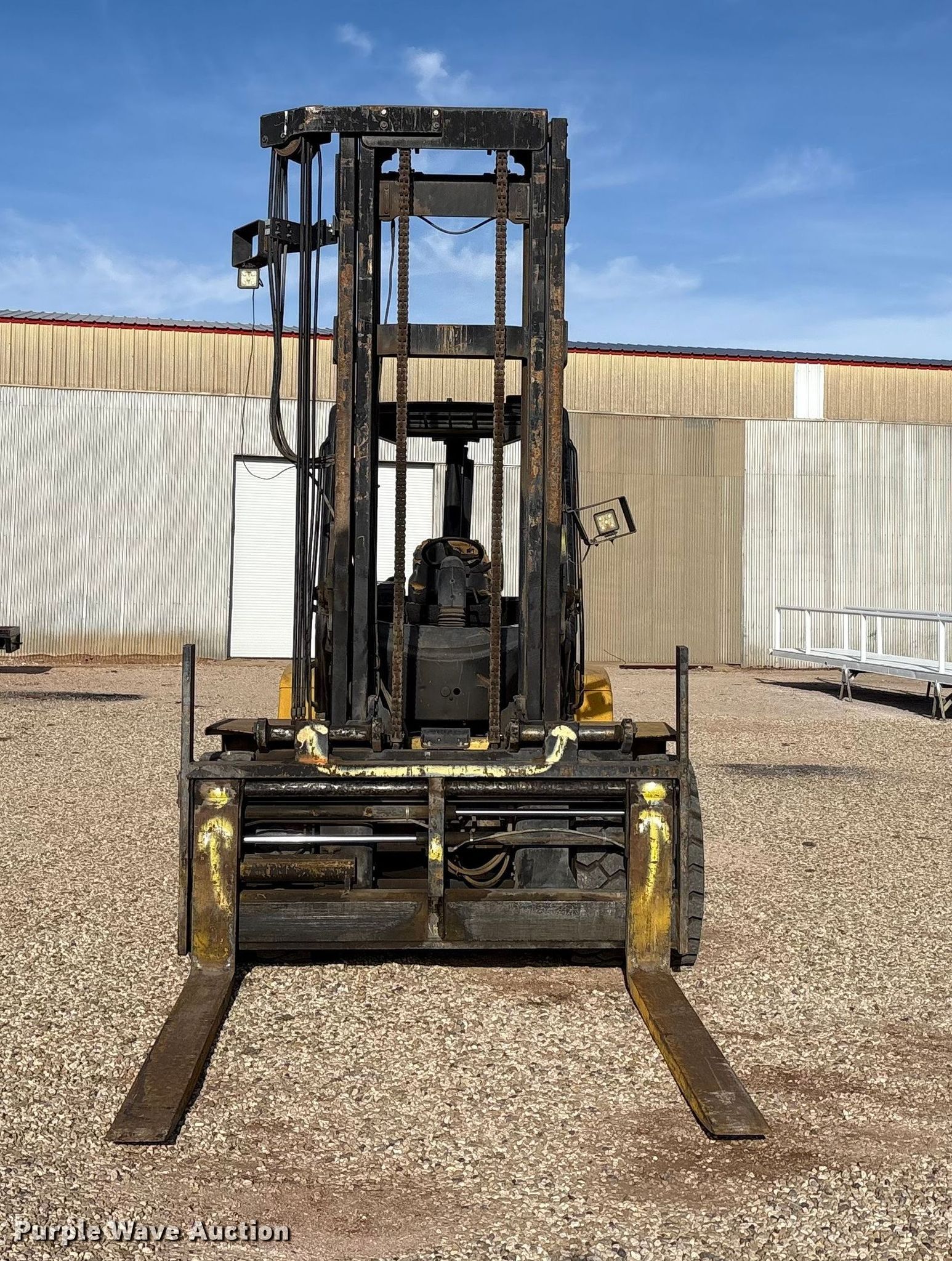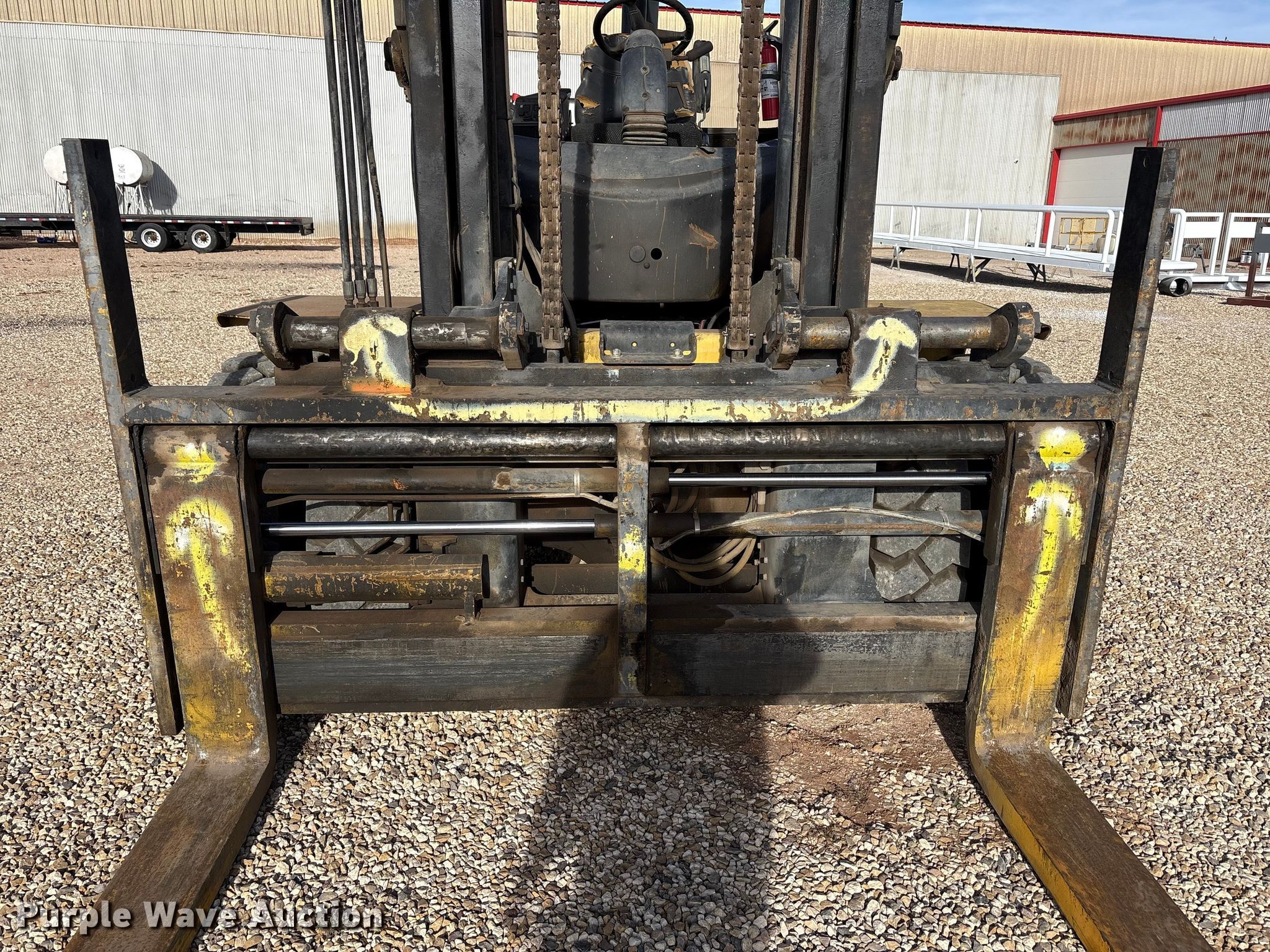 Hyster H210HD forklift. Hours: 10,691 on meter, Serial: G007E03180E. Engine Cummins, Cylinders: 6, Fuel type: Diesel. Transmission Powershift, 4F - 4R. Operators station OROPS. Features Maximum lift capacity: 18,350 lbs, Maximum lift height: 212", Collapsed mast height: 142", Mast stages: 2, Side shift, Mast tilt, Fork positioner, Fork length: 85". Tires Size: 10.00-20NHS, Foam filled. Hargrave Manufacturing. Slaton, TX 79364