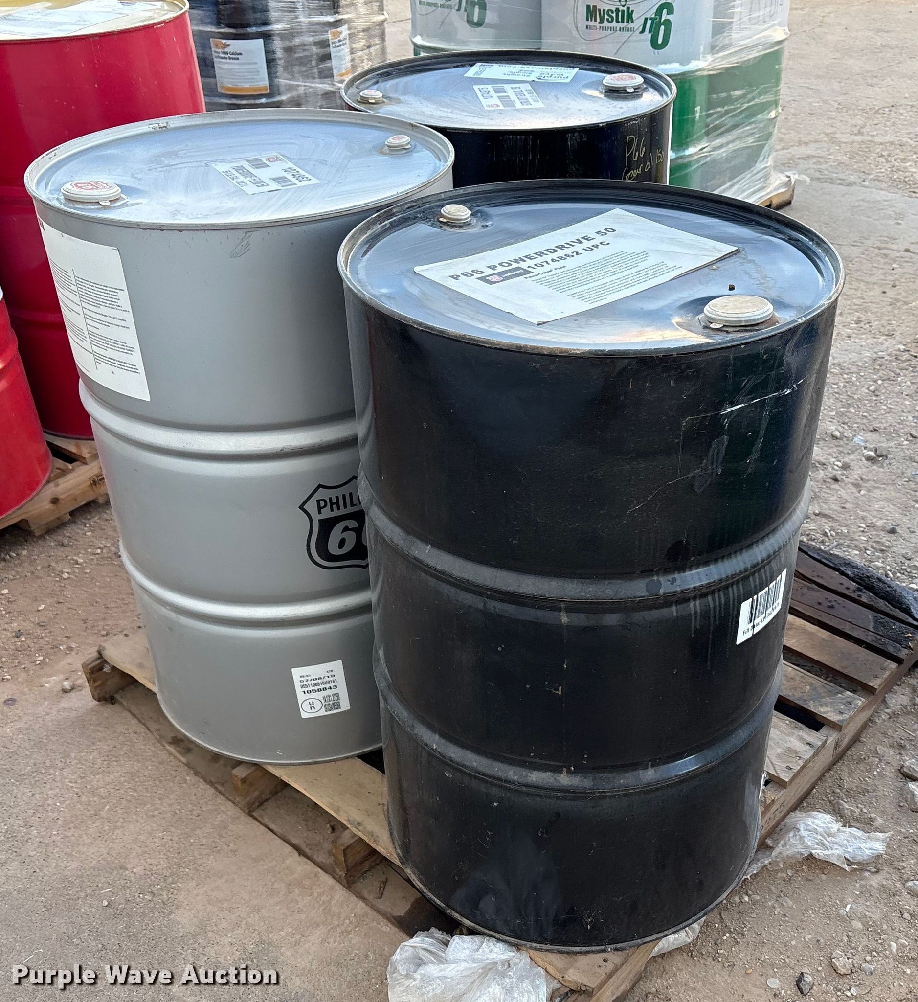 Purple Wave is selling a used Tools in Texas. This item is a (3) barrels of oil with the following: Phillips 66 extra heavy gear oil 150, (2) barrels of Phillips 66 power drive 50, Unused
