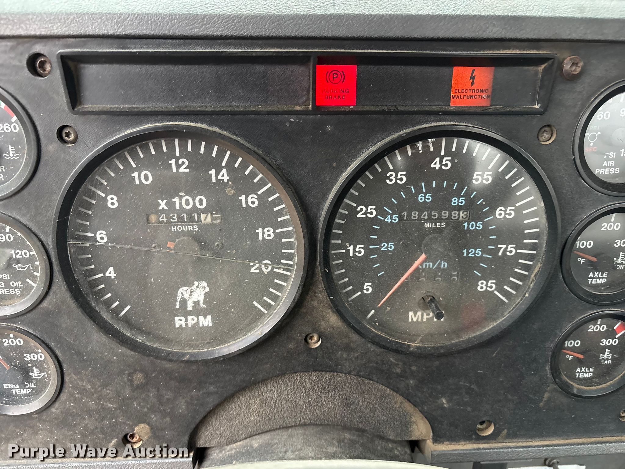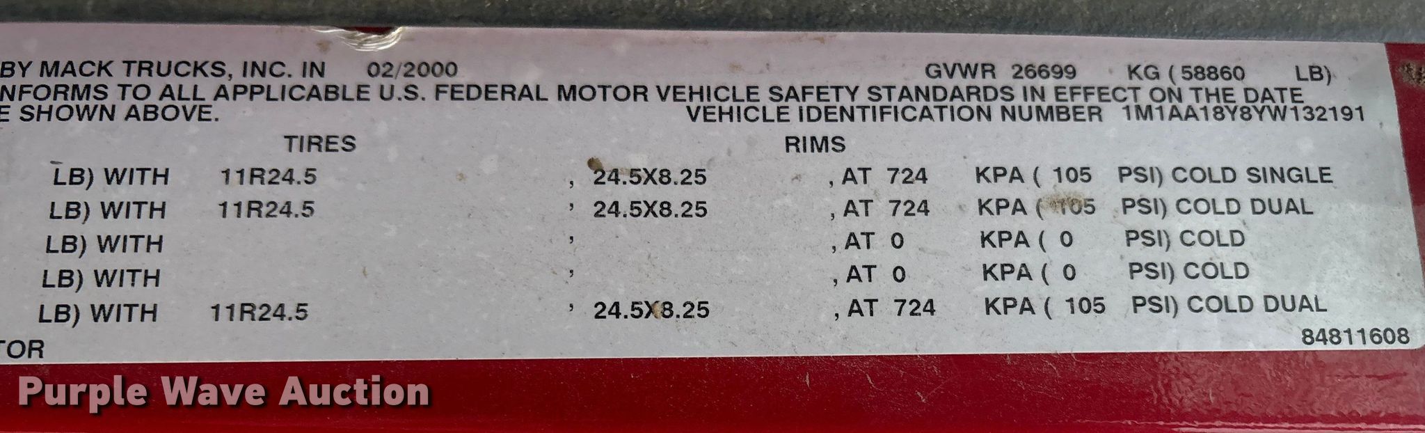 2000 Mack CH600 semi truck. Miles: 184,599 on odometer, Hours: 14,312 on meter, VIN: 1M1AA18Y8YW132191. Engine Displacement: 12.0L, Cylinders: 6, Fuel type: Diesel. Transmission Eaton Fuller, Manual, Speed: 13. Chassis Axles: Triple, Pusher axle Steerable, Suspension: Air, Brakes: Air, PTO, Wet kit, GVWR: 58,860 lbs. Interior AC, Heat, Cruise control, Auxiliary controls. Features Deck plate: Steel, Fifth wheel type: Air operated, Sliding, Fuel tank: Dual. Tires Size: 11R24.5, Lift axle: 11R22.5. Notes Dash warning indicator: Electronic Malfunction, Frame rust damage , Unknown operating condition of A/C. Nebraska title. Title distribution may be delayed up to 14 days from verification of funds. Peitzmeier Demolition. Omaha, NE 68122